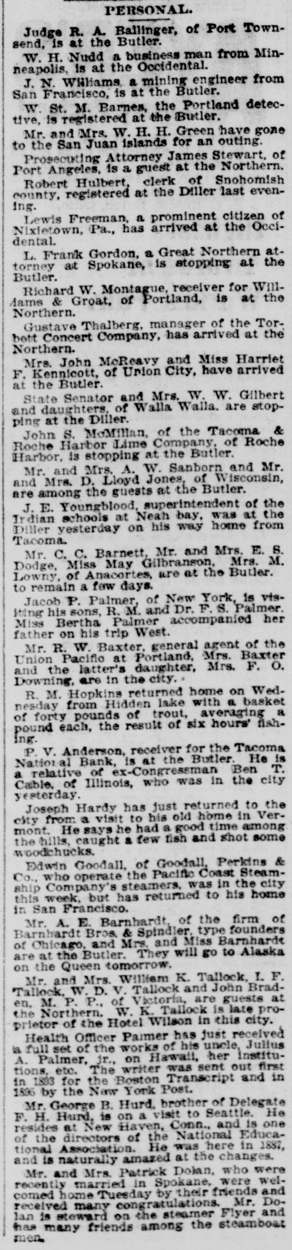 PERSONAL. Judge R. A. Ballinger, of Port Townsend, is at the Butler. W. H. Nudd a business man from Minneapolis, is at the Occidental. J. N. Williams a mining engineer from San Francisco, is at the Butler. W. St. M. Barnes, the Portland detective, is registered at the Butler. Mr. and Mrs. W. H. H. Green have gone to the San Juan islands for an outing. Prosecuting Attorney James Stewart, of Port Angeles, is a guest at the Northern. Robert Hulbert, clerk of Snohomish county, registered at the Diller last evening. Lewis Freeman, a prominent citizen of Nixietown, Pa., has arrived at the Occidental. L. Frank Gordon, a Great Northern attorney at Spokane, is stopping at the Butler. Richard W. Montague, receiver for Willdams & Groat, of Portland, is at the Northern. Gustave Thalberg, manager of the Torbett Concert Company, has arrived at the Northern. Mrs. John McReavy and Miss Harriet F. Kennicott, of Union City, have arrived at the Butler. State Senator and Mrs. W. W. Gilbert and daughters, of Walla Walla. are stopping at the Diller. John S. MoMillan, of the Tacoma & Roche Harbor Lime Company, of Roche Harbor, is stopping at the Butler. Mr. and Mrs. A. W. Sanborn and Mr. and Mrs. D. Lloyd Jones, of Wisconsin, are among the guests at the Butler. J. E. Youngblood, superintendent of the Irdian schools at Neah bay, was at the Diller yesterday on his way home from Tacoma. Mr. C. C. Barnett, Mr. and Mrs. E. S. Dodge, Miss May Gilbranson, Mrs. M. Lowny, of Anacortes, are at the Butler. to remain a few days. Jacob P. Palmer, of New York, is visiting his sons, R. M. and Dr. F. S. Palmer. Miss Bertha Palmer accompanied her father on his trip West. Mr. R. W. Baxter, general agent of the Union Pacific at Portland, Mrs. Baxter and the latter's daughter, Mrs. F. O. Downing, are in the city. R. M. Hopkins returned home on Wednesday from Hidden lake with a basket of forty pounds of trout, averaging a pound each, the result of six hours' fishing. P. V. Anderson, receiver for the Tacoma National Bank, is at the Butler. He is a relative of ex-Congressman Ben T. Cable, of Illinois, who was in the city yesterday. Joseph Hardy has just returned to the city from a visit to his old home in Vermont. He says he had a good time among the hills, caught a few fish and shot some woodchucks. Edwin Goodall, of Goodall, Perkins & Co., who operate the Pacific Coast Steamship Company's steamers, was in the city this week, but has returned to his home in San Francisco. Mr. A. E. Barnhardt, of the firm of Barnhardt Bros. & Spindler, type founders of Chicago, and Mrs. and Miss Barnhardt are at the Butler. They will go to Alaska on the Queen tomorrow. Mr. and Mrs. William K. Tallock, I. F. Tallock, W. D. V. Tallock and John Braden, M. P. P., of Victoria, are guests at the Northern. W. K. Tallock is late proprietor of the Hotel Wilson in this city. Health Officer Paimer has just received a full set of the works of his uncle, Julius A. Palmer, jr., on Hawaii, her institutions, etc. The writer was sent out first in 1893 for the Boston Transcript and in 1896 by the New York Post. Mr. George B. Hurd, brother of Delegate F. H. Hurd, is on a visit to Seattle. He resides at New Haven, Conn., and is one of the directors of the National Educational Association. He was here in 1887, and is naturally amazed at the changes. Mr. and Mrs. Patrick Dolan, who were recently married in Spokane, were welcomed home Tuesday by their friends and received many congratulations. Mr. Dolan is steward on the steamer Flyer and than many friends among the steamboat men.