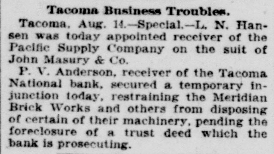 Tacoma Business Troubles. Tacoma, Aug. 14.-Special.-L. N. Hansen was today appointed receiver of the Pacific Supply Company on the suit of John Masury & Co. P. V. Anderson, receiver of the Tacoma National bank, secured a temporary injunction today, restraining the Meridian Brick Works and others from disposing of certain of their machinery, pending the foreclosure of a trust deed which the bank is prosecuting.