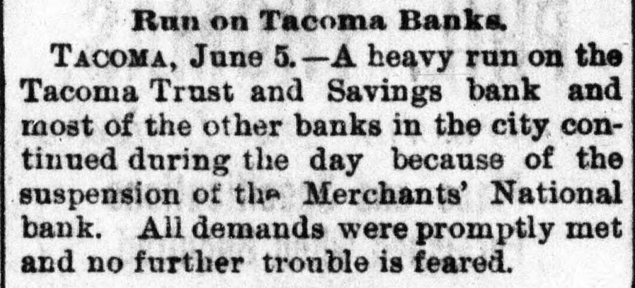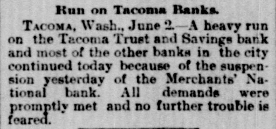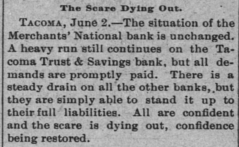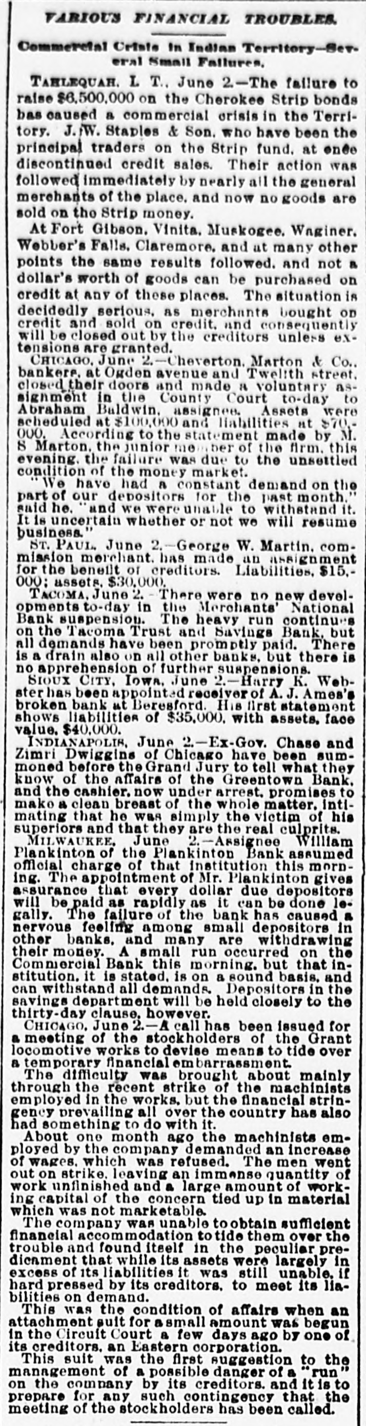 FINANCIAL WRECKS. Stationery Manufacturers Drawu Down by the Flurry. BOSTON. June 2.-The Thorp & Martin Manufacturing company, manutacturers of stationery, etc., 14 Milk street, with a factory at 113 Purchase street, has assigned. No exact statement of the company's financial condition has yet been prepared. but the liabilities are said to be about $125,000. The nominal assets are understood to be about $100,000, but subject to considerable depreciation in case of immediate conversion into money. Mr. Thorp is liable as indorser of a large amount of the coinpany's liabilities, and has made an individual assignment. CHICAGO. June 2.-Cheverton, Martin & Co., private bankers, made a voluntary assignment today. Assets were scheduled at $100,000, and liabilities at $70,000. According to M. S. Martin, the junior member of the firm, the failure is due to the unsettled condition of the money market. TACOMA, Wash., June 2.-A heavy run on the Tacoma Trust and Savings bank and most of the other banks in the city continued today because of the suspension yesterday of the Merchants' National bank. All demands were promptly met, and no further trouble is feared. WASHINGTON, June2.-The total net gold in the treasury at the close of business today was $91,429,271. This does not take into account the gold engaged today at New York for shipment tomorrow. No advices as to how much was engaged had been received at the treasury at the close of business. Because of the heavy shipments of gold from New York Secretary Carlisle has ordered gold shipped from three other subtreasuries to New York to keep up the supply, and this gold is now on its way to New York. SIOUX CITY, Io., June 2.-Harry K. Webster has been appointed receiver of A. J. Ames' broken bank at Beresford. His first statement shows liabilities of $35,000, with assets, face value $40,000. TOLEDO, O., June 2.-C. W. Bond was this afternoon appointed receiver for Isaac D. Smead & Co. to take charge of the personal affairs of Isaac D. Smead. This action in no way affects the Smead Heating and Ventilating company. NEWARK, N.J., June 2.-Judge Kirkpatrick was this morning appointed receiver of the Domestic Sewing Machine company. WASHINGTON, June 2.-A committee consisting of Messrs. Bennett and Strait, representing the failed Chemical National Bank of Chicago, had a conference with Comptroller Eckels today with a view to the bank resuming business. They were assured that if they could present evidence insuring the stability of the bank in the future they would be permitted to resume. MILWAUKEE, June 2.-Assignee William Plankinton, of the Plankinton bank, assumed official charge of that institution this morning. A feeling of security to all depositors pervades the atmosphere today, as the appointment of Mr. Plankinton gives assurance that every dollar due depositors will be paid as rapidly as it can be legally done. The failure of the bank has caused a nervous feeling among small depositors in other banks, and many are withdrawing their money. A small run occurred on the Commercial bank this morning, but the institution is on a sound basis, and can withstand all demands. PAULDING, O., June 2. - Potter's bank, the oldest bank in Paulding county, and heretofore considered one of the safest, closed its doors this morning. The bank was established in 1874, and has always done a large banking business. GLOUCESTER, Mess., June .-Edward Hodkiss & Co., fish dealers, have made an assignment, with liabilities estimated at $40,000 and assets small.