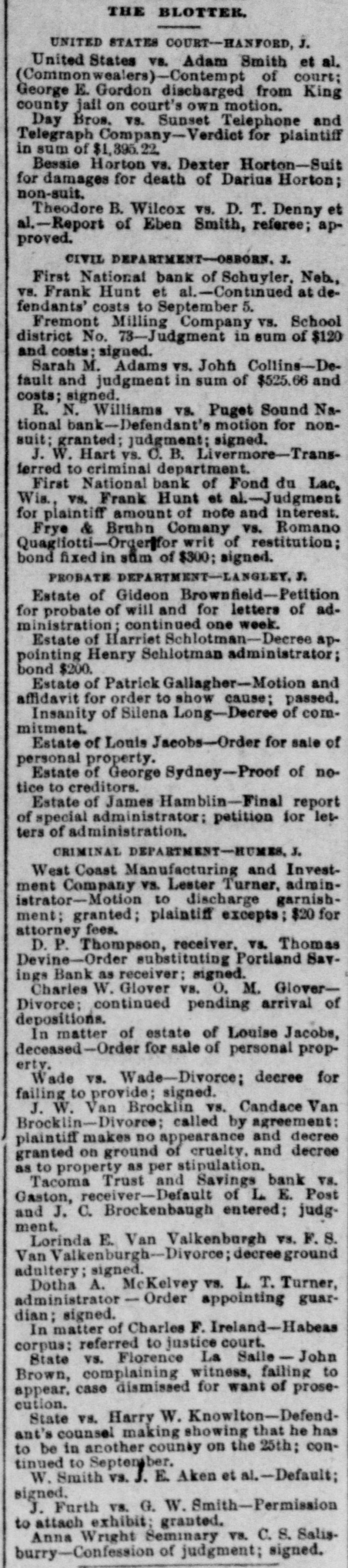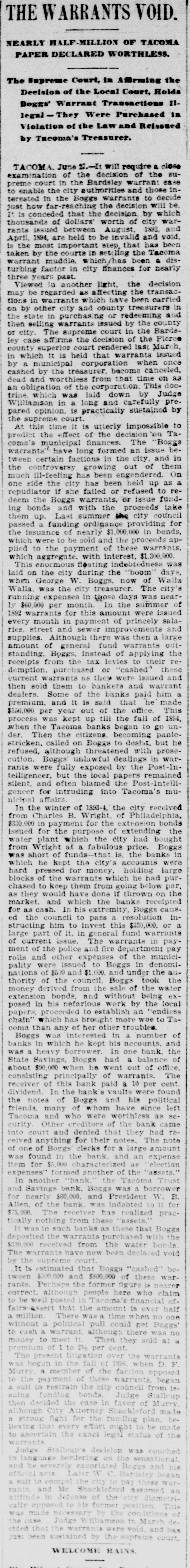 THE ARRANTS VOID. NEARLY HALF-MILLION OF TACOMA PAPER DECLARED WORTHLESS. The Supreme Court. in Affirming the Decision of the Local Court, Holds Boggs' Warrant Transactions 11legal They Were Purchased in Violation of the Law and Reissued by Tacoma's Treasurer. TACOMA. June 27.-It will require a close examination of the decision of the supreme court in the Bardsley warrant case to enable the city authorities and those interested in the Boggs warrants to decide just how far-reaching the decision will be. It is conceded that the decision, by which thousands of dollars' worth of city warrants issued between August, 1892. and April, 1894, are held to be invalid and void. is the most important step. that has been taken by the courts in setting the Tacoma warrant muddle, which/has been a disturbing factor in city finances for nearly three years past. Viewed to another light, the decision may be regarded as affecting the transactions in warrants which have been carried on by other city and county treasurers in the state in purchasi or redeeming and then selling warrants issued by the county or city. The supreme court in the Bardsley case affirms the decision of the Pierce county superior court rendered last Mar h, in which it is held that warrants issued by a municipal corporation when once cashed by the treasurer, become canceled, dead and worthless from that time on as an obligation of the corporation. This doctrine, which was laid down by Judge Williamson in a long and carefully prepared opinion. is practically sustained by the supreme court. At this time it is utterly impossible to predict the effect of the decision on Tacoma's municipal finances. The Boggs warrants" have long formed an issue between certain factions in the city, and in the controversy growing out of them much ill-feeling has been engendered. On one side the city has been held up as a repudiator if she failed or refused to redeem the Boggs warrants, or issue funding bonds and with the proceeds take them up. Last summer the city council passed funding ordinance providing for the Issuance of nearly $1,000,000 in bonds, which were to be sold and the proceeds applied to the payment of these warrants, which aggregate. with interest. $1,300,000. This enormous fleating indebtedness was laid on the city during the boom days, when George W Boggs, now of Walla Walla was the city treasurer. The city's running expenses in those days was nearly $60,000 per month In the summer of 1892 warrants for this amount were issued every month in payment of princely salaries, street and sewer improvements and supplies. Although there was then a large amount of general fund warrants outstanding, Boggs, instead of applying the receipts from the tax levies to their redemption. purchased or cashed these current warrants as they were issued and then sold them to bankers and warrant dealers Some of the banks paid him a premium, and it is said that he made $150,000 per year out of the office. This process was kept up till the fall of 1894, when the Taeoma banks began to go under. Then the citizens becoming panicstricken. called on Boggs to desist, but he refused. although threatened with prosecution. Boggs unlawful dealings in warrants were fully exposed by the Post Intelligencer, but the local papers remained silent and often blamed the Post Intelligencer for intruding into Tacoma's muaffairs. nicipal In the winter of 1893-4, the city received from Charles B. Wright of Philadelphia, $330,000 in payment for the extension bonds issued for the purpose of extending the water plant which the city had bought from Wright at a fabulous price. Boggs was short of funds that is, the banks in which he kept the city's accounts were hard pressed for money, holding large blocks of the warrants which he had purchased to keep them from going below par, as they would have done if thrown on the market and which the banks receipted for as cash. In his extremity Boggs caused the council to pass resolution instructing him to invest this $330,000. or a large part of It, in general fund warrants of current issue. The warrants in payment of the police and fire department pay rolls and other expenses of the municipality were issued to Boggs in denominations of $500 and 000. and under the authority of the council Boggs took the money derived from the sale of the water extension bonds and without being exposed in his nefarious work by the local papers, proceeded to establish an "endless chain' which has brought more woe to Tacoma than any of her other troubles. Boggs was terested in a number of banks in which he kept his accounts. and was a heavy borrower In one bank the State Savings, Boggs had a balance of about $90,000 when he went out of office, consisting principally of warrants. The receiver of this bank paid a 10 per cent. dividend In the bank's vaults were found the notes of Boggs and his political friends many of whom have since left Tacoma and who were worthless as security Other creditors of the bank came into court and denied that they had recelved anything for their notes. The note of one of Boggs clerks for a large amount was found in the bank and an expense item for $5,000 haracterized as election expenses' formed another of the 'assets. In another "bank the Tacoma Trust and Savings bank. Boggs was a borrower for nearly $60,000. and President W B. Allen of the bank was indebted to it for $75,000 The receiver has realized practically nothing from these assets. It was in such banks as these that Boggs deposited the warrants purchased with the $330,000 received from the water bonds The warrants have now been decla void by the supreme court It is estimated that Boggs "cashed" between $300,000 and $800,000 of these warrants. Perhaps the former figure is nearer correct although people here who claim to be well posted Tacoma's financial af. fairs assert that the amount is over half a million There was a time when no one without a political pull could get Boggs' to cash a war
