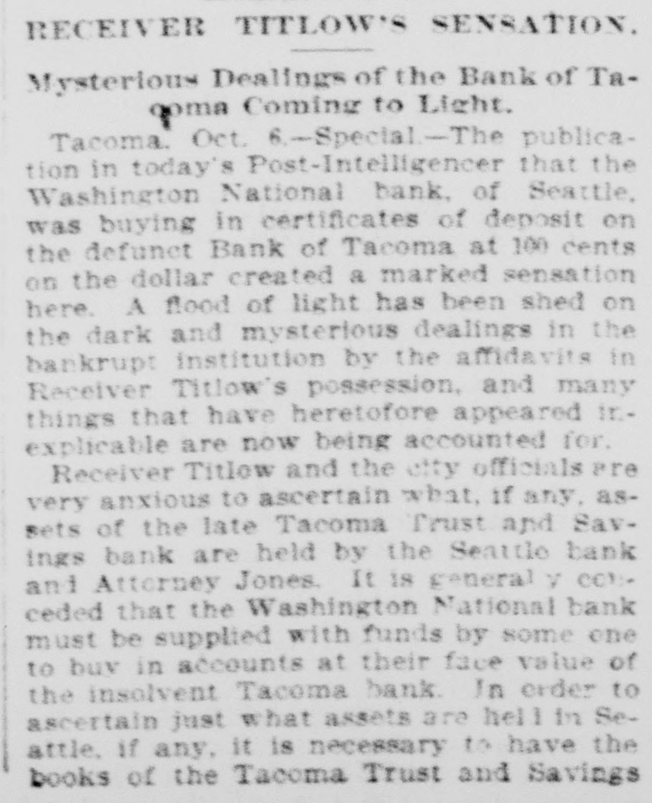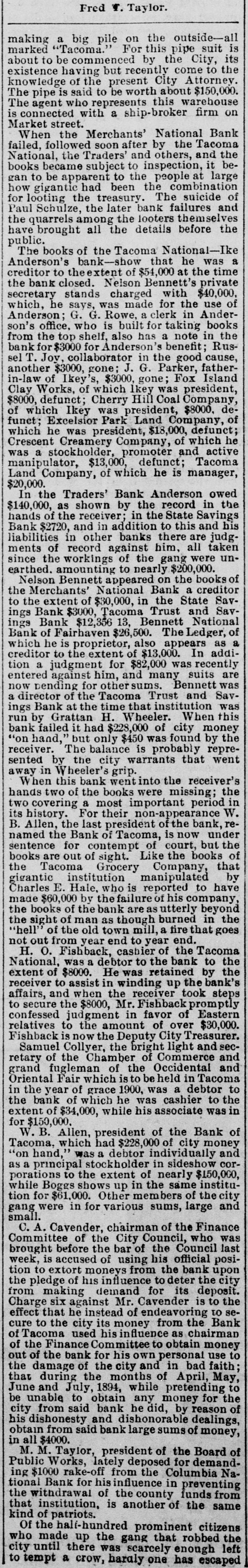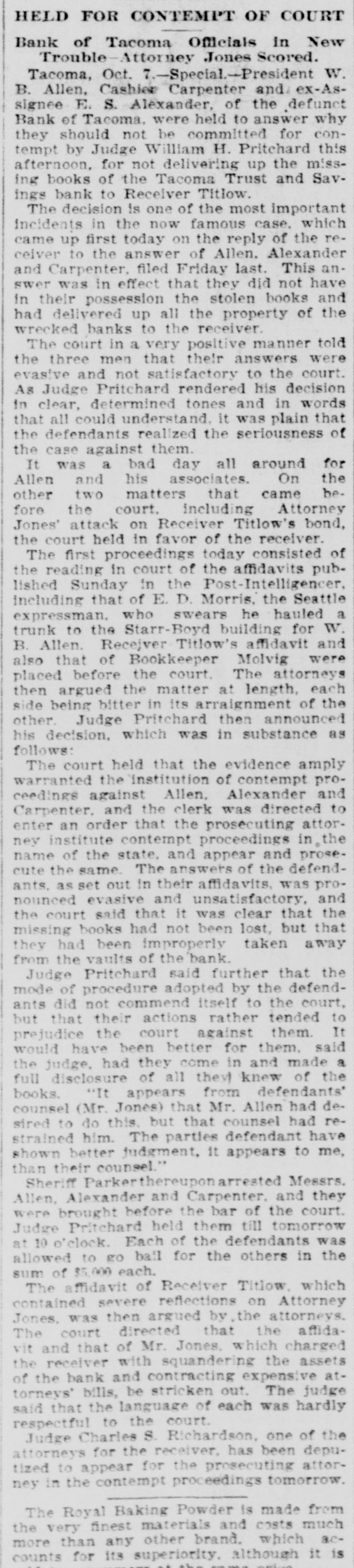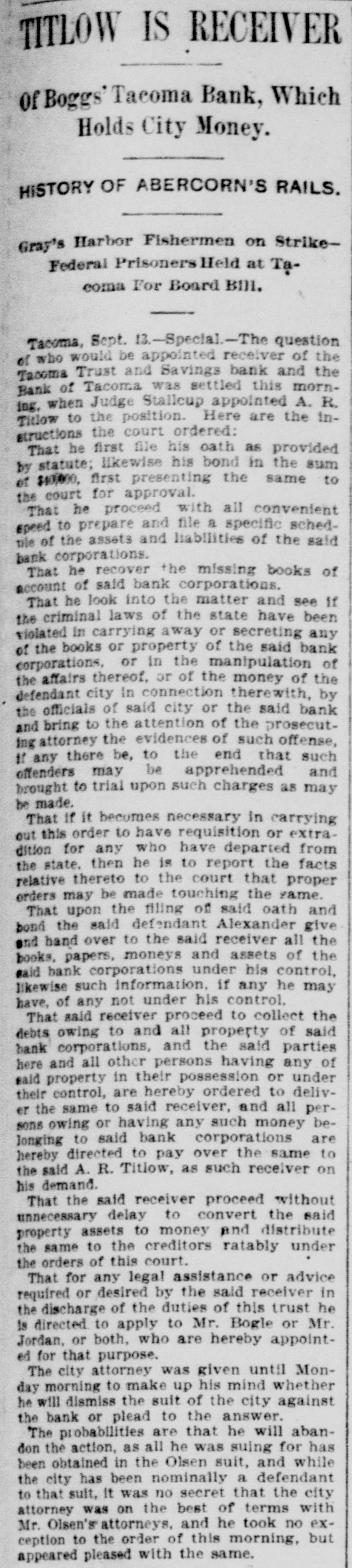 TITLOW IS RECEIVER Of Boggs' Tacoma Bank, Which Holds City Money. HISTORY OF ABERCORN'S RAILS. Gray's Harbor Fishermen on StrikeFederal Prisoners Held at Tacoma For Board BIII. Tacoma, Sept. 13.-Special.-The question of who would be appointed receiver of the Tacoma Trust and Savings bank and the Bank of Tacoma was settled this morning. when Judge Stallcup appointed A. R. Titlow to the position. Here are the instructions the court ordered: That he first file his oath as provided by statute; likewise his bond in the sum of $400000, first presenting the same to the court for approval. That he proceed with all convenient speed to prepare and file a specific schedtile of the assets and liabilities of the said bank corporations. That he recover the missing books of account of said bank corporations. That he look into the matter and see If the criminal laws of the state have been violated in carrying away or secreting any of the books or property of the said bank corporations, or in the manipulation of the affairs thereof, or of the money of the defendant city In connection therewith, by the officials of said city or the said bank and bring to the attention of the prosecuting attorney the evidences of such offense, If any there be, to the end that such offenders may be apprehended and brought to trial upon such charges as may be made. That If it becomes necessary In carrying out this order to have requisition or extradition for any who have departed from the state. then he is to report the facts relative thereto to the court that proper orders may be made touching the same. That upon the filing of said oath and bond the said defendant Alexander give and hand over to the said receiver all the books, papers, moneys and assets of the said bank corporations under his control, likewise such information, if any he may have, of any not under his control. That said receiver proceed to collect the debts owing to and all property of said bank corporations, and the said parties here and all other persons having any of said property in their possession or under their control, are hereby ordered to deliver the same to said receiver, and all persons owing or having any such money belonging to said bank corporations are hereby directed to pay over the same to the said A. R. Titlow, as such receiver on his demand. That the said receiver proceed without unnecessary delay to convert the said property assets to money and distribute the same to the creditors ratably under the orders of this court. That for any legal assistance or advice required or desired by the said receiver in the discharge of the duties of this trust he is directed to apply to Mr. Bogle or Mr. Jordan, or both, who are hereby appointed for that purpose. The city attorney was given until Monday morning to make up his mind whether he will dismiss the suit of the city against the bank or plead to the answer. The probabilities are that he will abandon the action, as all he was suing for has been obtained in the Olsen suit, and while the city has been nominally a defendant to that suit, It was no secret that the city attorney was on the best of terms with Mr. Olsen's attorneys, and he took no exception to the order of this morning, but appeared pleased with the same.