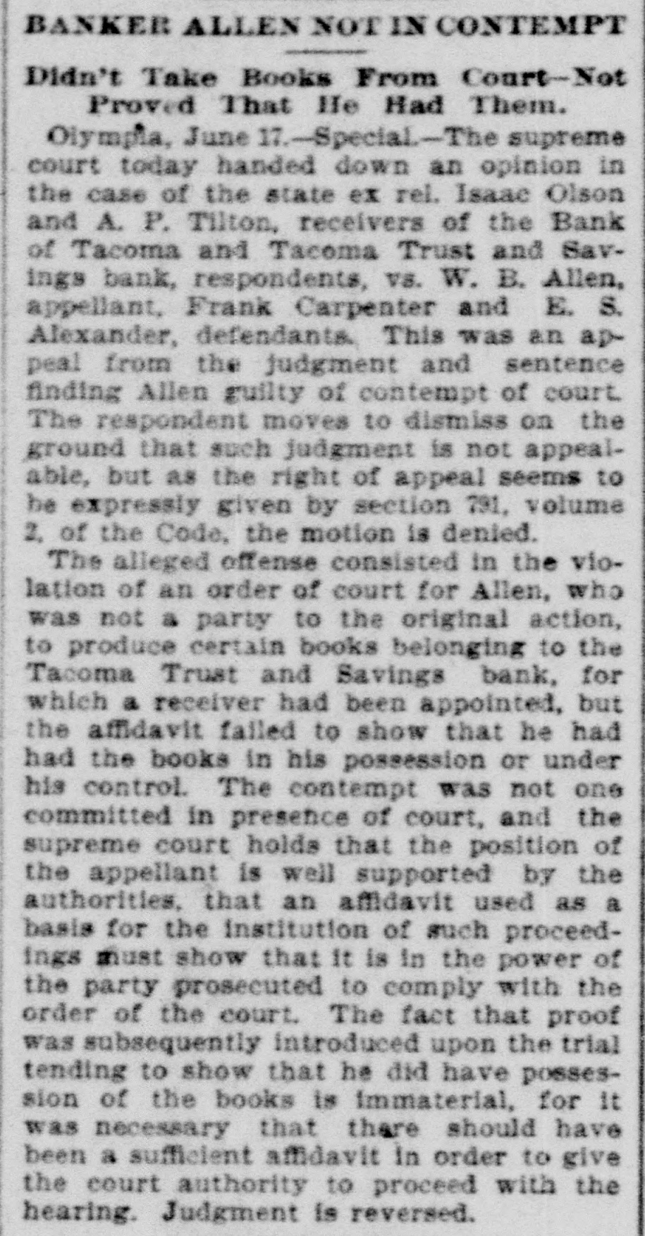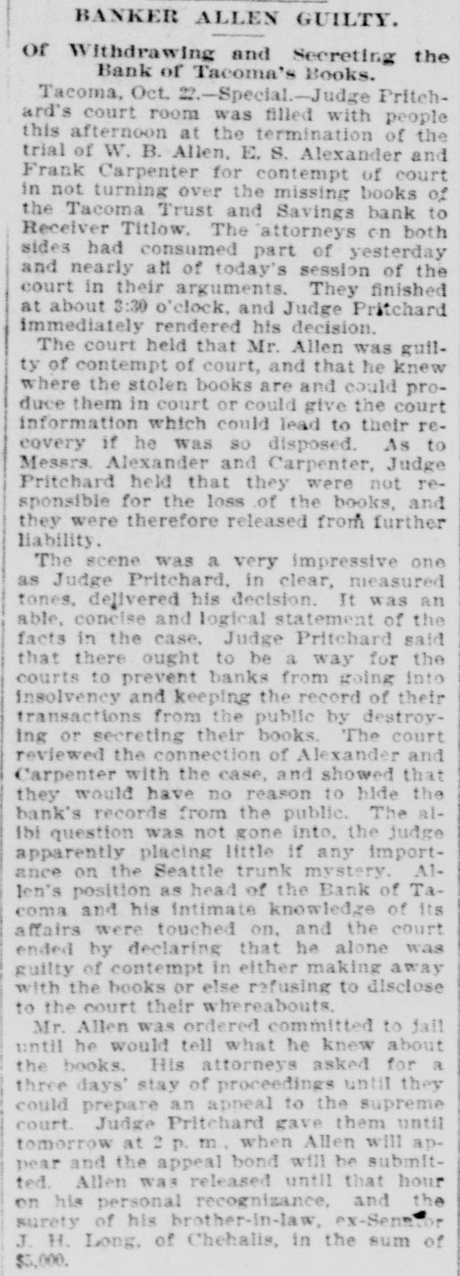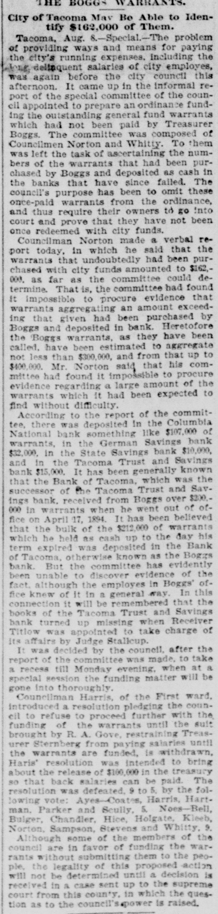 TITLOW IS RECEIVER Of Boggs' Tacoma Bank, Which Holds City Money. HISTORY OF ABERCORN'S RAILS. Gray's Harbor Fishermen on StrikeFederal Prisoners Held at Tacoma For Board BIII. Tacoma, Sept. 13.-Special.-The question of who would be appointed receiver of the Tacoma Trust and Savings bank and the Bank of Tacoma was settled this morning. when Judge Stallcup appointed A. R. Titlow to the position. Here are the instructions the court ordered: That he first file his oath as provided by statute; likewise his bond in the sum of $400000, first presenting the same to the court for approval. That he proceed with all convenient speed to prepare and file a specific schedtile of the assets and liabilities of the said bank corporations. That he recover the missing books of account of said bank corporations. That he look into the matter and see If the criminal laws of the state have been violated in carrying away or secreting any of the books or property of the said bank corporations, or in the manipulation of the affairs thereof, or of the money of the defendant city In connection therewith, by the officials of said city or the said bank and bring to the attention of the prosecuting attorney the evidences of such offense, If any there be, to the end that such offenders may be apprehended and brought to trial upon such charges as may be made. That If it becomes necessary In carrying out this order to have requisition or extradition for any who have departed from the state. then he is to report the facts relative thereto to the court that proper orders may be made touching the same. That upon the filing of said oath and bond the said defendant Alexander give and hand over to the said receiver all the books, papers, moneys and assets of the said bank corporations under his control, likewise such information, if any he may have, of any not under his control. That said receiver proceed to collect the debts owing to and all property of said bank corporations, and the said parties here and all other persons having any of said property in their possession or under their control, are hereby ordered to deliver the same to said receiver, and all persons owing or having any such money belonging to said bank corporations are hereby directed to pay over the same to the said A. R. Titlow, as such receiver on his demand. That the said receiver proceed without unnecessary delay to convert the said property assets to money and distribute the same to the creditors ratably under the orders of this court. That for any legal assistance or advice required or desired by the said receiver in the discharge of the duties of this trust he is directed to apply to Mr. Bogle or Mr. Jordan, or both, who are hereby appointed for that purpose. The city attorney was given until Monday morning to make up his mind whether he will dismiss the suit of the city against the bank or plead to the answer. The probabilities are that he will abandon the action, as all he was suing for has been obtained in the Olsen suit, and while the city has been nominally a defendant to that suit, It was no secret that the city attorney was on the best of terms with Mr. Olsen's attorneys, and he took no exception to the order of this morning, but appeared pleased with the same.