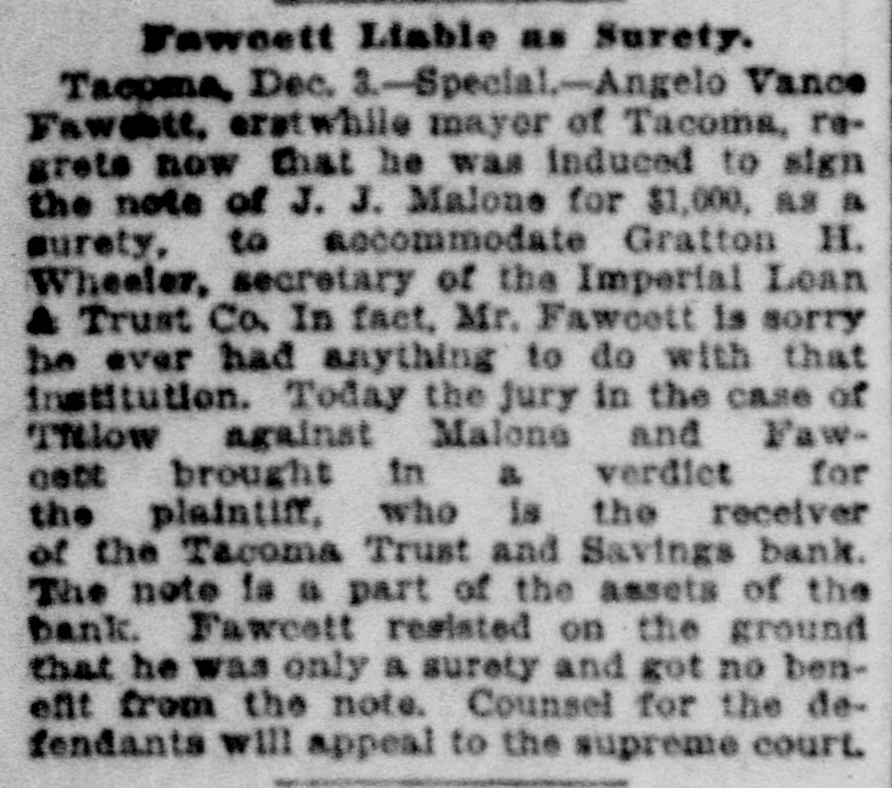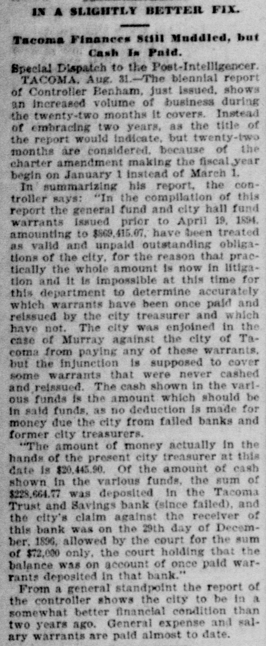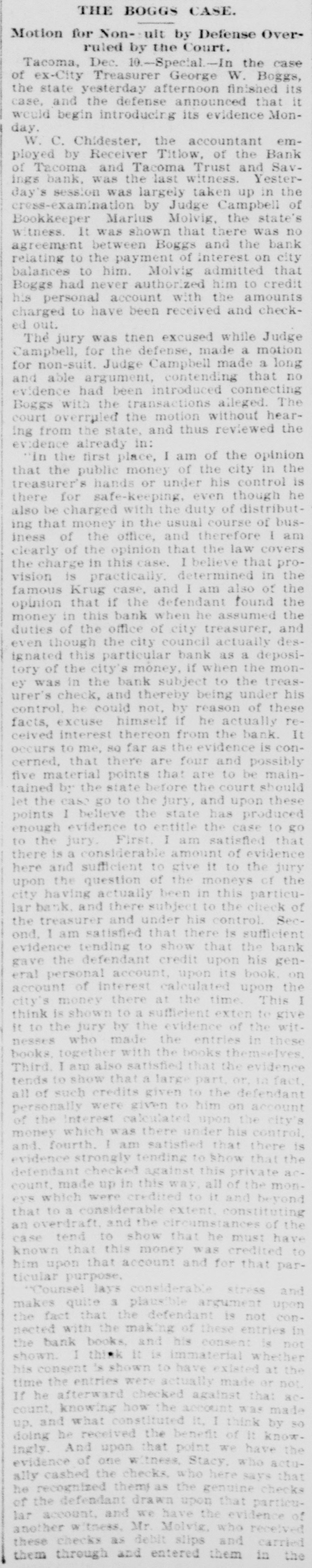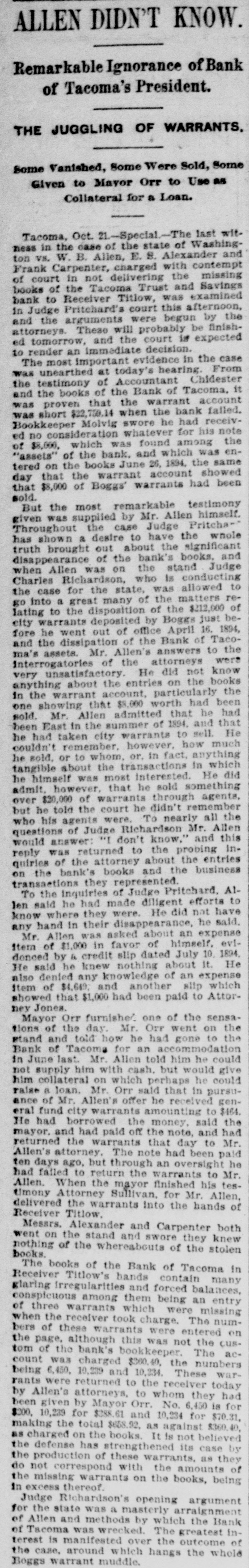 TITLOW IS RECEIVER Of Boggs' Tacoma Bank, Which Holds City Money. HISTORY OF ABERCORN'S RAILS. Gray's Harbor Fishermen on StrikeFederal Prisoners Held at Tacoma For Board BIII. Tacoma, Sept. 13.-Special.-The question of who would be appointed receiver of the Tacoma Trust and Savings bank and the Bank of Tacoma was settled this morning. when Judge Stallcup appointed A. R. Titlow to the position. Here are the instructions the court ordered: That he first file his oath as provided by statute; likewise his bond in the sum of $400000, first presenting the same to the court for approval. That he proceed with all convenient speed to prepare and file a specific schedtile of the assets and liabilities of the said bank corporations. That he recover the missing books of account of said bank corporations. That he look into the matter and see If the criminal laws of the state have been violated in carrying away or secreting any of the books or property of the said bank corporations, or in the manipulation of the affairs thereof, or of the money of the defendant city In connection therewith, by the officials of said city or the said bank and bring to the attention of the prosecuting attorney the evidences of such offense, If any there be, to the end that such offenders may be apprehended and brought to trial upon such charges as may be made. That If it becomes necessary In carrying out this order to have requisition or extradition for any who have departed from the state. then he is to report the facts relative thereto to the court that proper orders may be made touching the same. That upon the filing of said oath and bond the said defendant Alexander give and hand over to the said receiver all the books, papers, moneys and assets of the said bank corporations under his control, likewise such information, if any he may have, of any not under his control. That said receiver proceed to collect the debts owing to and all property of said bank corporations, and the said parties here and all other persons having any of said property in their possession or under their control, are hereby ordered to deliver the same to said receiver, and all persons owing or having any such money belonging to said bank corporations are hereby directed to pay over the same to the said A. R. Titlow, as such receiver on his demand. That the said receiver proceed without unnecessary delay to convert the said property assets to money and distribute the same to the creditors ratably under the orders of this court. That for any legal assistance or advice required or desired by the said receiver in the discharge of the duties of this trust he is directed to apply to Mr. Bogle or Mr. Jordan, or both, who are hereby appointed for that purpose. The city attorney was given until Monday morning to make up his mind whether he will dismiss the suit of the city against the bank or plead to the answer. The probabilities are that he will abandon the action, as all he was suing for has been obtained in the Olsen suit, and while the city has been nominally a defendant to that suit, It was no secret that the city attorney was on the best of terms with Mr. Olsen's attorneys, and he took no exception to the order of this morning, but appeared pleased with the same.