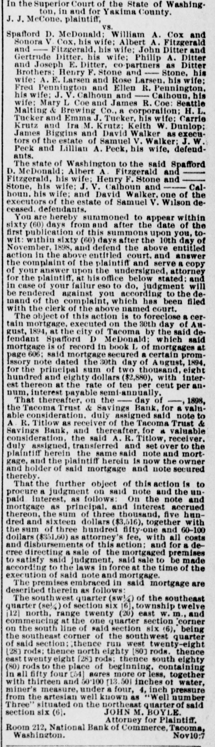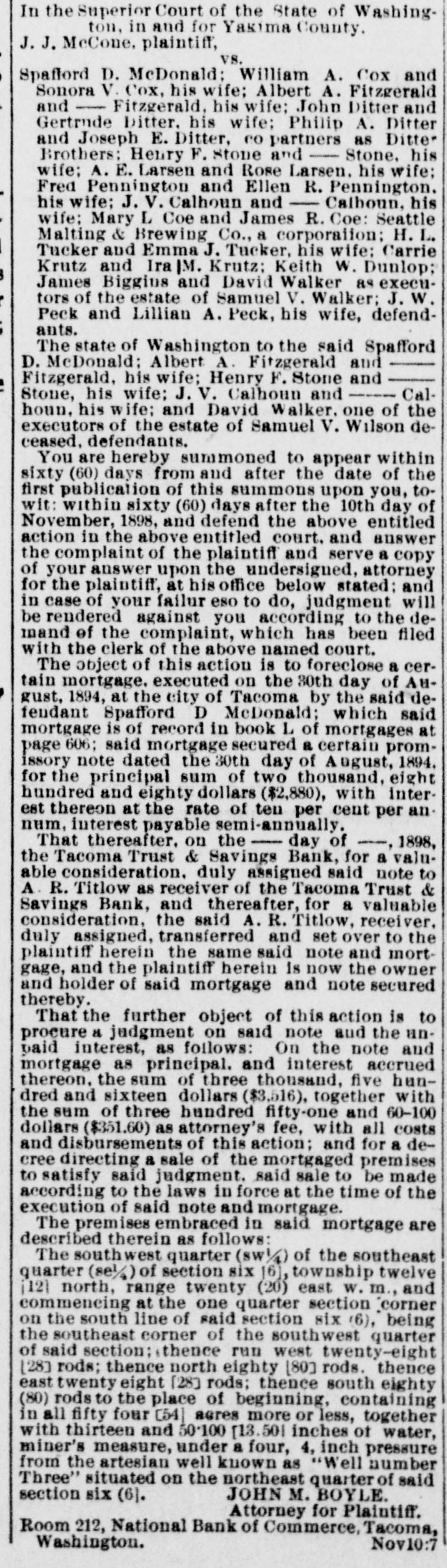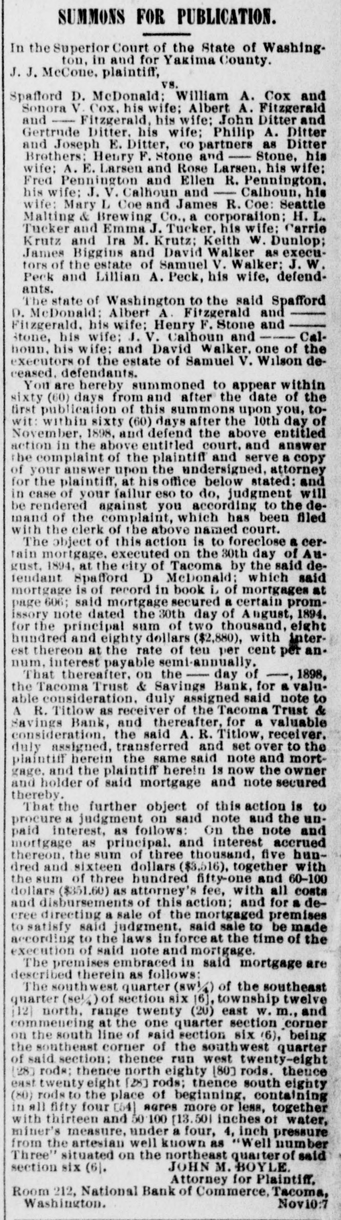 SUMMONS FOR PUBLICATION. / In the Superior Court of the State of Washington, in and for Yakima County. J. J. McCone, plaintiff, vs. Spafford D. McDonald; William A. Cox and Sonora V. Cox, his wife; Albert A. Fitzgeraid and - Fitzgerald, his wife; John Ditter and Gertrude Ditter, his wife; Philip A. Ditter and Joseph E. Ditter, co-partners as Ditter Brothers; Henry F. Stone and - Stone, his wife; A. E. Larsen and Rose Larsen, his wife; Fred Pennington and Ellen R. Pennington, his wife; J. V. Calhoun and - Calhoun, his wife: Mary L. Coe and James R. Coe: Seattle Malting & Brewing Co., a corporation; H. L. Tucker and Emma J. Tucker, his wife: Carrie Krautz and Ira M. Krautz; Keith W. Dunlap; James Biggins and David Walker as executors of the estate of Samuel V. Walker; J. W. Peck and Lillian A. Peck, his wife, defendants. The state of Washington to the said Spafford D. McDonald; Albert A. Fitzgerald and Fitzgerald, his wife; Henry F. Stone and CatStone, his wife; J. V. Calhoun and houn. his wife; and David Walker. one of the executors of the estate of Samuel V. Wilson deceased, defendants. You are hereby summoned to appear within sixty (60) days from and after the date of the first publication of this summons upon you, towit: within sixty (60) days after the 10th day of November, 1898, and defend the above entitled action in the above entitled court. and answer the complaint of the plaintiff and serve a copy of your answer upon the undersigned, attorney for the plaintiff, at his office below stated: and in case of your failur eso to do, judgment will be rendered against you according to the demand of the complaint, which has been filed with the clerk of the above named court. The object of this action is to foreclose a certain mortgage, executed on the 30th day of August, 1894, at the city of Tacoma by the said defendant Spafford D McDonald; which said mortgage is of record in book L of mortgages at page 606; said mortgage secured a certain promissory note dated the 30th day of August, 1894. for the principal sum of two thousand, eight hundred and eighty dollars ($2,880), with interest thereon at the rate of ten per cent per an. num, interest payable semi-annually. That thereafter, on the - day of - . 1898, the Tacoma Trust & Savings Bank, for a valuable consideration. duly assigned said note to A. R. Titlow as receiver of the Tacoma Trust & Savings Bank, and thereafter, for a valuable consideration. the said A. R. Titlow, receiver. duly assigned, transferred and set over to the plaintiff herein the same said note and mortgage, and the plaintiff herein is now the owner and holder of said mortgage and note secured thereby. That the further object of this action is to procure a judgment on said note and the unpaid interest, as follows: On the note and