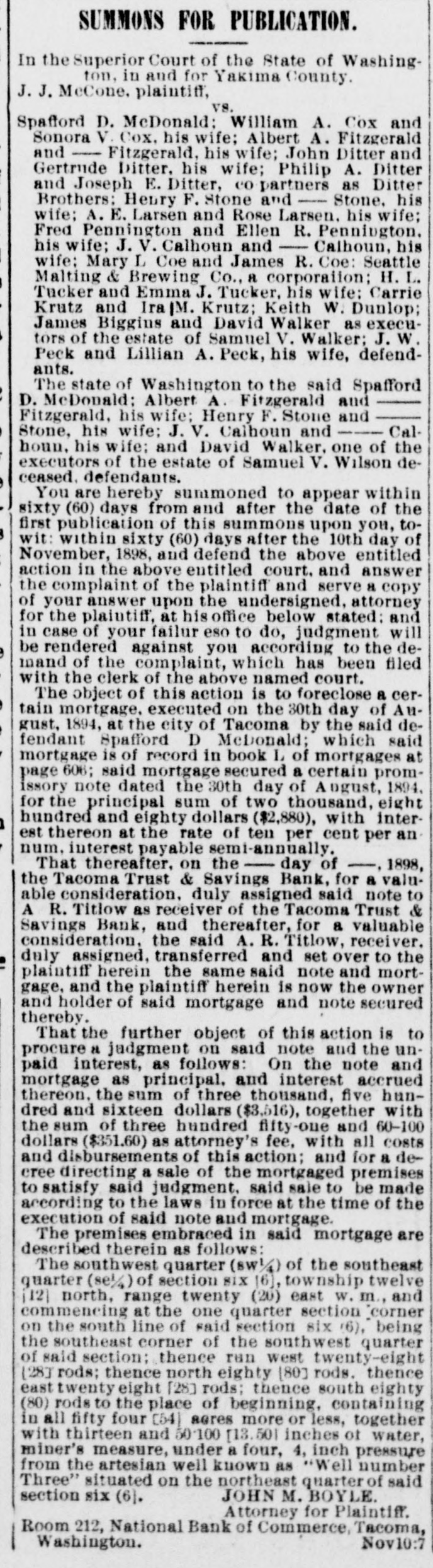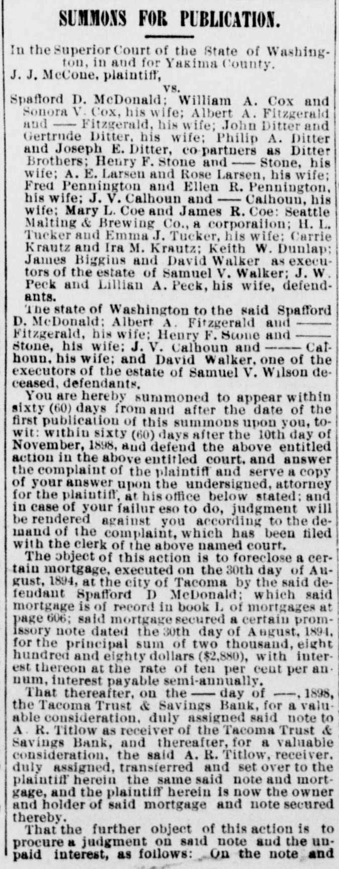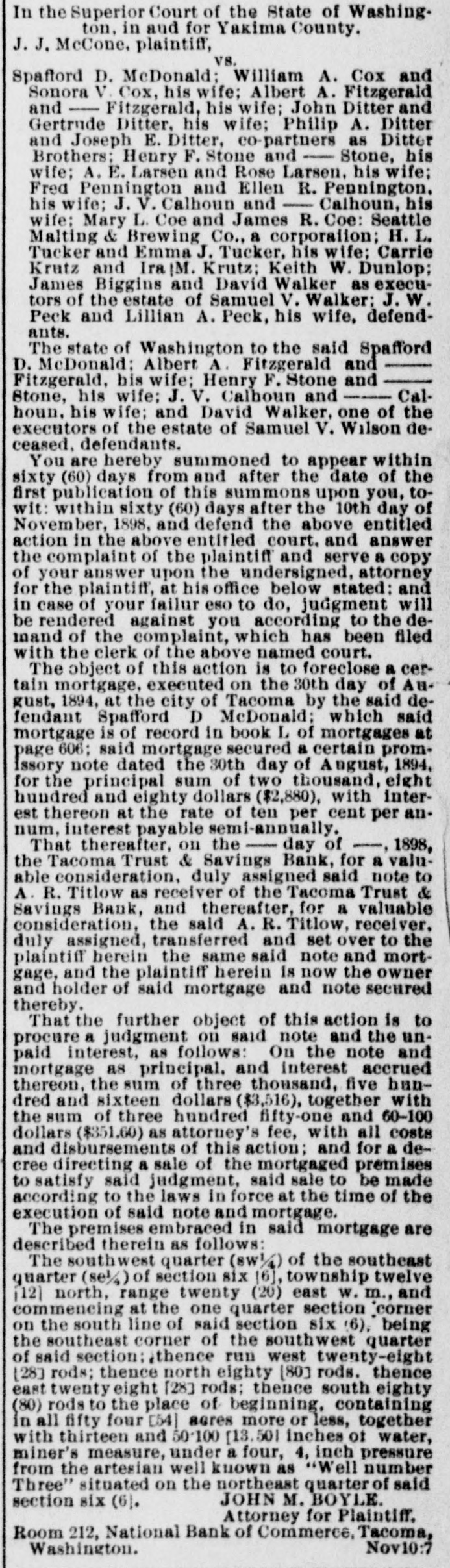 SUMMONS FOR PUBLICATION. / In the Superior Court of the State of Washington, in and for Yakima County. J. J. McCone, plaintiff, vs. Spafford D. McDonald; William A. Cox and Sonora V. Cox, his wife; Albert A. Fitzgeraid and - Fitzgerald, his wife; John Ditter and Gertrude Ditter, his wife; Philip A. Ditter and Joseph E. Ditter, co-partners as Ditter Brothers; Henry F. Stone and - Stone, his wife; A. E. Larsen and Rose Larsen, his wife; Fred Pennington and Ellen R. Pennington, his wife; J. V. Calhoun and - Calhoun, his wife: Mary L. Coe and James R. Coe: Seattle Malting & Brewing Co., a corporation; H. L. Tucker and Emma J. Tucker, his wife: Carrie Krautz and Ira M. Krautz; Keith W. Dunlap; James Biggins and David Walker as executors of the estate of Samuel V. Walker; J. W. Peck and Lillian A. Peck, his wife, defendants. The state of Washington to the said Spafford D. McDonald; Albert A. Fitzgerald and Fitzgerald, his wife; Henry F. Stone and CatStone, his wife; J. V. Calhoun and houn. his wife; and David Walker. one of the executors of the estate of Samuel V. Wilson deceased, defendants. You are hereby summoned to appear within sixty (60) days from and after the date of the first publication of this summons upon you, towit: within sixty (60) days after the 10th day of November, 1898, and defend the above entitled action in the above entitled court. and answer the complaint of the plaintiff and serve a copy of your answer upon the undersigned, attorney for the plaintiff, at his office below stated: and in case of your failur eso to do, judgment will be rendered against you according to the demand of the complaint, which has been filed with the clerk of the above named court. The object of this action is to foreclose a certain mortgage, executed on the 30th day of August, 1894, at the city of Tacoma by the said defendant Spafford D McDonald; which said mortgage is of record in book L of mortgages at page 606; said mortgage secured a certain promissory note dated the 30th day of August, 1894. for the principal sum of two thousand, eight hundred and eighty dollars ($2,880), with interest thereon at the rate of ten per cent per an. num, interest payable semi-annually. That thereafter, on the - day of - . 1898, the Tacoma Trust & Savings Bank, for a valuable consideration. duly assigned said note to A. R. Titlow as receiver of the Tacoma Trust & Savings Bank, and thereafter, for a valuable consideration. the said A. R. Titlow, receiver. duly assigned, transferred and set over to the plaintiff herein the same said note and mortgage, and the plaintiff herein is now the owner and holder of said mortgage and note secured thereby. That the further object of this action is to procure a judgment on said note and the unpaid interest, as follows: On the note and