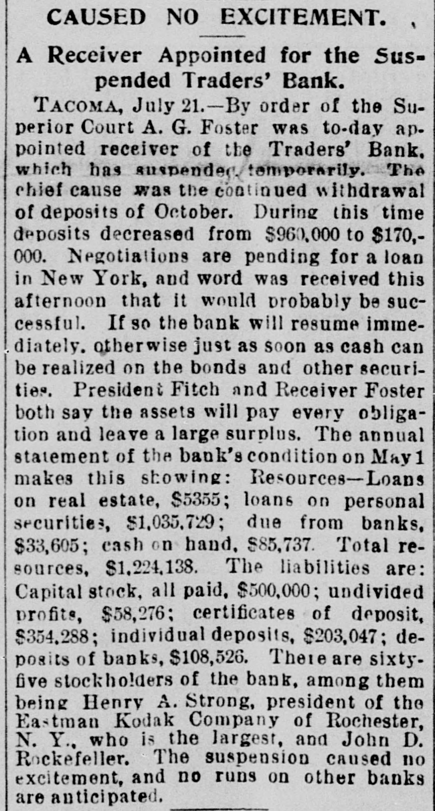 CAUSED NO EXCITEMENT. A Receiver Appointed for the Suspended Traders' Bank. TACOMA, July 21.-By order of the Superior Court A. G. Foster WAS to-day ap. pointed receiver of the Traders' Bank. which has suspended temporarily. The chief cause was the continued withdrawal of deposits of October. During this time deposits decreased from $960,000 to $170,000. Negotiations are pending for a loan in New York, and word was received this afternoon that it would probably be successful. If so the bank will resume immediately. otherwise just as soon as cash can be realized on the bonds and other securities. President Fitch and Receiver Foster both say the assets will pay every obligation and leave a large surplus. The annual statement of the bank's condition on May 1 makes this showing: Resources-Loans on real estate, $5355; loans on personal securities, $1,035,729; due from banks, $33,605; cash on hand, $85,737. Total resources, $1,224,138. The liabilities are: Capital stock, all paid, $500,000; undivided profits, $58,276; certificates of deposit, $354,288; individual deposits, $203,047; deposits of banks, $108,526. Thereare sixtyfive stockholders of the bank, among them being Henry A. Strong, president of the Eastman Kodak Company of Rochester, N. Y., who is the largest, and John D. Rockefeller. The suspension caused no excitement, and no runs on other banks are anticipated.