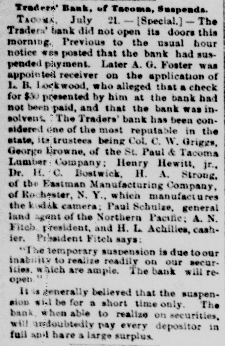 Traders' Bank, of Tacoma, Suspends. TACOMA, July 21. - [Special.] - The Traders' bank did not open its doors this morning. Previous to the usual hour notice was posted that the bank had suspended payment. Later A. G. Foster was appointed receiver on the application of L B. Lockwood, who alleged that a check for $50 presented by him at the bank had not been paid, and that the bank was insolvent. 7 The Traders' bank has been considered one of the most reputable in the state, its trustees being Col. C. W. Griggs, George Browne, of the St. Paul & Tacoma Lumber Company: Henry Hewitt, jr., Dr. H. C. Bostwick, H. A. Strong, of the Eastman Manufacturing Company, of Rochester, N. Y., which manufactures the kodak camera; Paul Schulze, general land agent of the Northern Pacific: A. N. Fitch president, and H. L Achilles, cashier. President Fitch says: "The temporary suspension is due to our inability to realize readily on our securities. which are ample. The bank will reopen." Ii is generally believed that the suspension will be for a short time only. The bank. when able to realize on securities, will andoubtedly pay every depositor in full and have & large surplus.