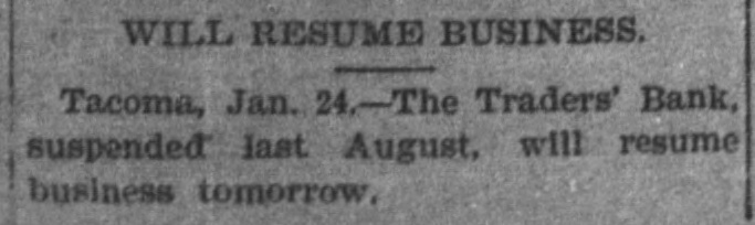 The Traders' bank which suspended July 2, will open its doors tomorrow morning. President Fitch says arrangements have been completed whereby the bank will open with increased strength, and every depositor who desires his money can have the same on presentation of his claims. Four of our trustees ... have put up out of their private funds ample security to meet every possible contingency . (Jan. 24 report.)