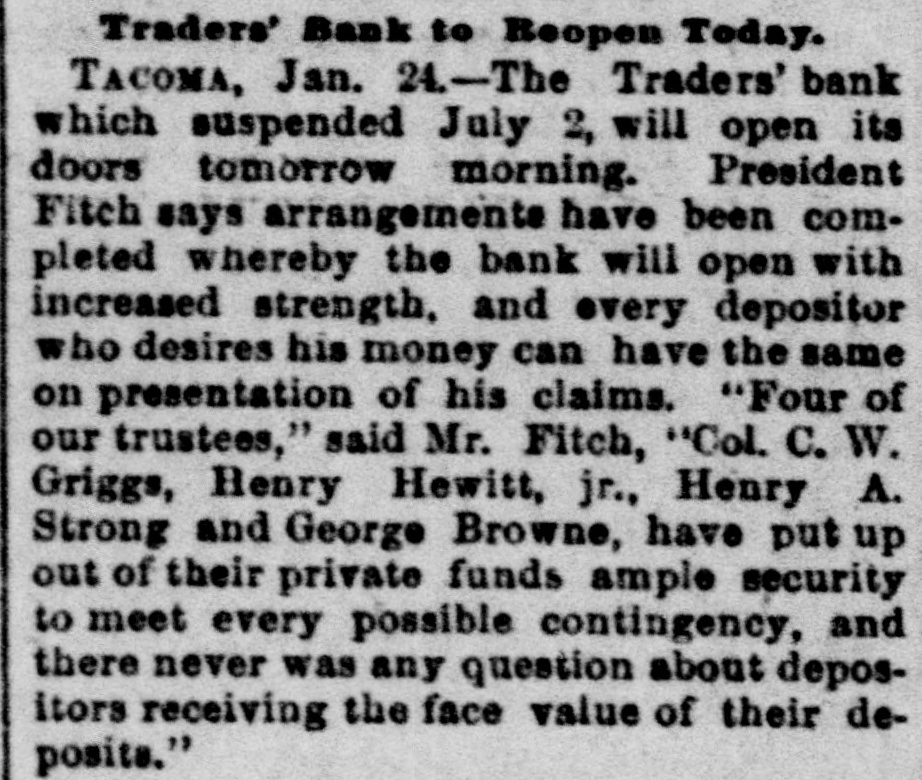 Traders' Bank to Reopen Today. TACOMA, Jan. 24.-The Traders' bank which suspended July 2, will open its doors tomorrow morning. President Fitch says arrangemente have been completed whereby the bank will open with increased strength, and overy depositor who desires his money can have the same on presentation of his claims. "Four of our trustees," said Mr. Fitch, "Col. C. W. Griggs, Henry Hewitt, jr., Henry A. Strong and George Browne, have put up out of their private funds ample security to meet every possible contingency, and there never was any question about depositors receiving the face value of their deposits."