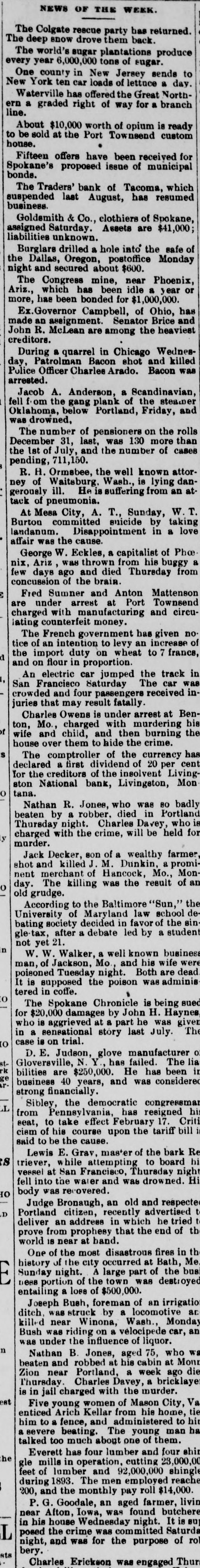 SHI 40 SMIN The Colgate rescue party has returned The deep snow drove them back. The world's sugar plantations produce every year 6,000,000 tons of sugar. One county in New Jersey sends New York ten car loads of lettuce a Waterville has offered the Great North ern line. a graded right of way for a branci About $10,000 worth of opium is to be house. sold at the Port Townsend custor Fifteen offers have been received fo bonds. Spokane's proposed issue of municipa The Traders' bank of Tacoma, whic business. suspended last August, has resume Goldsmith & Co., clothiers of Spokane assigned Saturday. Assets are $41,000 liabilities unknown. Burglars drilled a hole into the safe the Dallas, Oregon, postoffice Monda night and secured about $600. The Congress mine, near Phoenix Ariz., which has been idle a year more, has been bonded for $1,000,000. Ex.Governor Campbell, of Ohio, made an assignment. Senator Brice John R. creditors. McLean are among the heavier During a quarrel in Chicago Wedne day, Patrolman Bacon shot and kille Police arrested. Officer Charles Arado. Bacon Jacob A. Anderson, a Scandinavia fell f-om the gang plank of the steam Oklahoma, below Portland, Friday, was drowned, The number of pensioners on the December 31, last, was 130 more the the 1st of July, and the number of pending, 711,150. R. H. Ormsbee, the well known ney of Waitsburg, Wash., is lying us more sureeds st H 'III Revously tack of pneumonia. At Mesa City, A. T., Sunday, W. Burton committed suicide by takir B u! | affair was the cause. George W. Eckles, a capitalist of nix, Ariz, was thrown from his buggy few days ago and died Thursday concussion of the brain. 63 Fred Sumner and Anton Mattens are under arrest at Port Townser charged with manufacturing and lating counterfeit money. The French government has given tice of an intention to levy an increase the import duty on wheat to 7 franc p and on flour in proportion. An electric car jumped the track = San Francisco Saturday The car crowded and four passengers received juries that may result fatally. Charles Owens is under arrest at ton, Mo., charged with murdering JC wife and child, and then burning house over them to hide the crime. S The comptroller of the currency declared a first dividend of 20 per for the creditors of the insolvent o ston tana. National bank, Livingston, Nathan R. Jones, who was 80 beaten by a robber. died in Portla Thursday night. Charles Davey, charged with the crime, will be held & murder. Jack Decker, son of a wealthy farm shot and killed J. M. Dunkin, a nent merchant of Hancock, Mo., day. The killing was the result of 0 PIO According to the Baltimore "Sun," University of Maryland law school bating society decided in favor of the gle-tax, after a debate led by a stude not yet 21. u W. W. Walker, a well known busine man, of Jackson, Mo., and his wife poisoned Tuesday night. Both are It is supposed the poison was admin tered in coffe. O The Spokane Chronicle is being for $20,000 damages by John H. Hayn who is aggrieved at a part he was in a sensational story last July. trial uo " Case or D. E. Judson, glove manufacturer