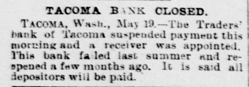 TACOMA BANK FAILURE. Tacoma, Wash., May 19.-On application of two trustees, the superior court today appointed Leonard Howarth receiver of the Traders' Bank of Tacoma. The bank will liquidate. The Traders' was one of the largest banks in Tacoma up to July, 1893, when, as a result of heavy withdrawals, the bank suspended, remaining closed until January 24 last, when it reopened.
