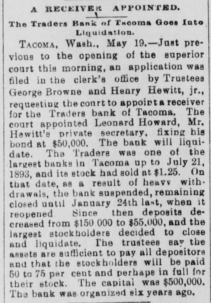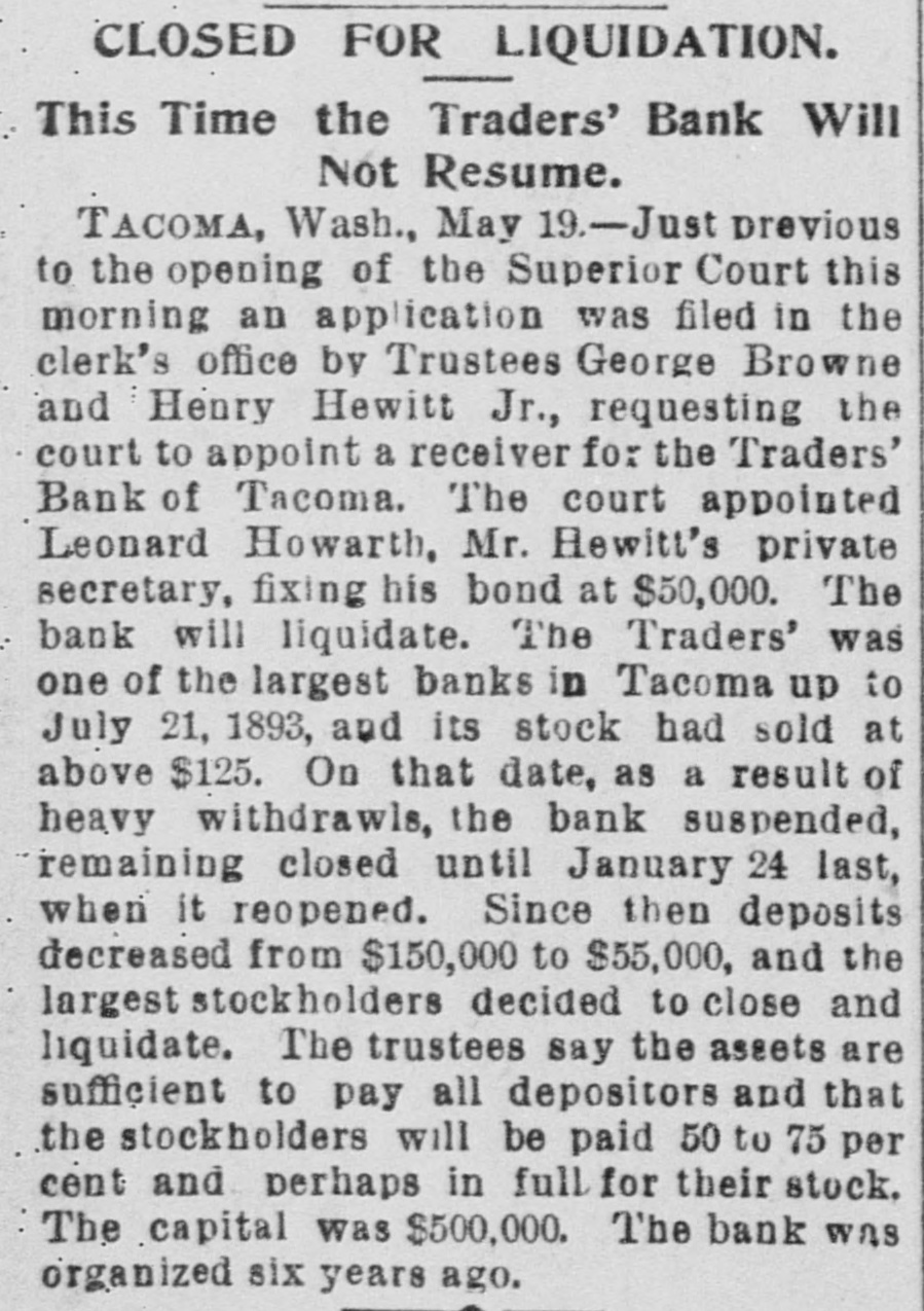 CLOSED FOR LIQUIDATION. This Time the Traders' Bank Will Not Resume. Tacoma, Wash., May 19.-Just previous to the opening of the Superior Court this morning an application was filed in the clerk's office by Trustees George Browne and Henry Hewitt Jr., requesting the court to appoint a receiver for the Traders' Bank of Tacoma. The court appointed Leonard Howarth, Mr. Hewitt's private secretary, fixing his bond at $50,000. The bank will liquidate. The Traders' was one of the largest banks in Tacoma up to July 21, 1893, and its stock had sold at above $125. On that date, as a result of heavy withdrawls, the bank suspended, remaining closed until January 24 last, when it reopened. Since then deposits decreased from $150,000 to $55,000, and the largest stockholders decided to close and liquidate. The trustees say the assets are sufficient to pay all depositors and that the stockholders will be paid 50 to 75 per cent and perhaps in full for their stock. The capital was $500,000. The bank was organized six years ago.