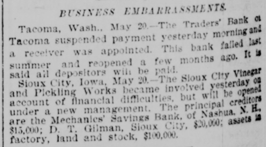 BUSINESS EMBARRASSMENTS Tacoma, Wash., May 20.-The Traders' Bank 01 Tacoma suspended payment yesterday morning and a receiver was appointed. This bank failed last summer and reopened a few months ago. It is said all depositors will be paid. Sioux City, Iowa, May 20.-The Sloux City Vinegar and Pickling Works became involved yesterday on account of financial difficulties, but will be opened under a new management. The principal creditors are the Mechanics' Savings Bank, of Nashua, N. H., $15,000; D. T. Gilman, Sioux City, $20,000; assets in factory, land and stock, $100,000.