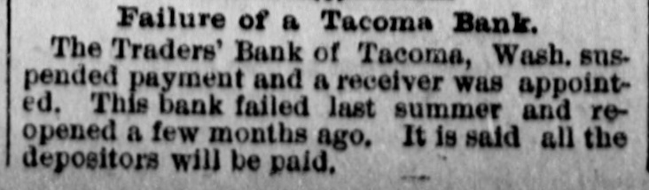 Failure of a Tacoma Bank. The Traders' Bank of Tacoma, Wash. suspended payment and a receiver was appointed. This bank failed last summer and reopened a few months ago, It is said all the depositors will be paid.
