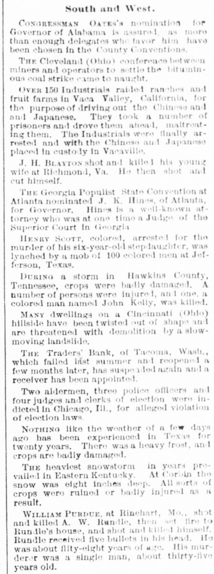South and West. CONGRESSMAN OATES'S nomination for Governor of Alabama is assured as more than enough delegates who favor him have been chosen in the County Conventions THE Cleveland (Ohio) conference between miners and operators to settle the bituminous coal strike came to naught. OVER 150 Industrials raided ranches and fruit farms in Vaca Valley, California, for the purpose of driving out the Chinese and and Japanese. They took a number of prisoners and drove them ahead, maltroating them. The Industrials were finally arrested and with the Chinese and Japanese placed in custody in Vacaville, J. H. BLAYTON shot and kille his young wife at Richmond, Va. He then shot and cut himself. THE Georgia Populist State Convention at Atlanta nominated J. K. Hines, of Atlanta, for Governor. Hines is a well-known attorney who was at one time a Judge of the Superior Court In Georgia HENRY SCOTT. colored, arrested for the murder of his six-year-oldstepdaughter was lynched by a mob of 100 colored men at Jefferson, Texas. DURING a storm in Hawkins County, Tennessee, crops were badly damaged. A number of persons were injured, and one. a colored man named John Kelly, was killed. MANY dwellings on a Cincinuati (Ohto) hillside have been twisted out of shape and are threatened with demolition by a slowmoving landslide. THE Traders' Bank, of Tacoma, Wash., which failed last summer and reopened a few months later, has suspended again and a receiver has been appointed. Two aldermen, three police officers and four judges and clerks of election were indicted in Chicago, Ill., for alleged violation of election laws. NOTHING like the weather of a few days ago has been experienced in Texas for twenty years. There was a heavy frost, and crops are badly damaged. THE heaviest snowstorm in years prevailed in Eastern Kentucky. At Corbin the snow was eight inches deep. All sorts of crops were rulned or badly injured as is result. WILLIAM PURDUE. at Rinehart, Mo., shot and killed A. W. Randle, then set fire to Rundle's house, and shot and killed himself. Rundle received five bullets in his head. He was about filty-eight years of age. His murderer was a single man, about thirty-five years old.