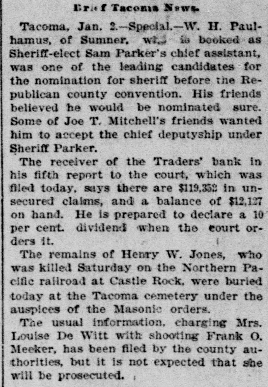 Brie f Tacoma News. Tacoma, Jan. 2.-Special.-W. H. Paulhamus, of Sumner, wt. is booked as Sheriff-elect Sam Parker's chief assistant, was one of the leading candidates for the nomination for sheriff before the Republican county convention. His friends believed he would be nominated sure. Some of Joe T. Mitchell's friends wanted him to accept the chief deputyship under Sheriff Parker. The receiver of the Traders' bank in his fifth report to the court, which was filed today, says there are $119,352 in unsecured claims, and a balance of $12,127 on hand. He is prepared to declare a 10 per cent. dividend when the court orders it. The remains of Henry W. Jones, who was killed Saturday on the Northern Pacific railroad at Castle Rock, were buried today at the Tacoma cemetery under the auspices of the Masonic orders. The usual information, charging Mrs. Louise De Witt with shooting Frank O. Meeker, has been filed by the county authorities, but it is not expected that she will be prosecuted.