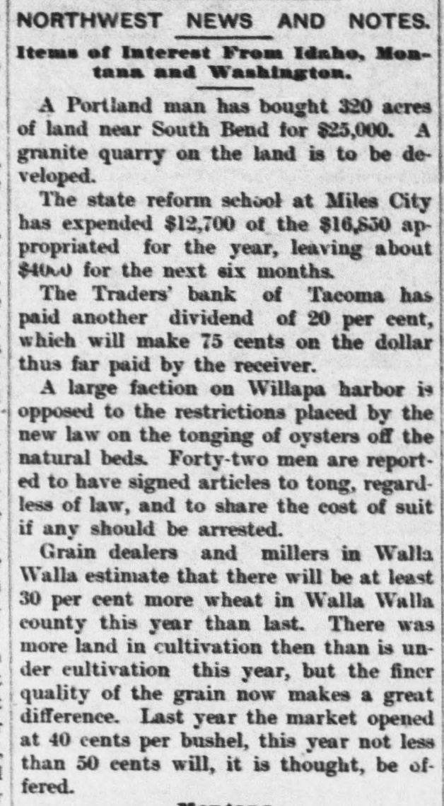 # NORTHWEST NEWS AND NOTES. Items of Interest From Idaho, Montana and Washington. A Portland man has bought 320 acres of land near South Bend for $25,000. A granite quarry on the land is to be developed. The state reform school at Miles City has expended $12,700 of the $16,850 appropriated for the year, leaving about $4000 for the next six months. The Traders' bank of Tacoma has paid another dividend of 20 per cent, which will make 75 cents on the dollar thus far paid by the receiver. A large faction on Willapa harbor is opposed to the restrictions placed by the new law on the tonging of oysters off the natural beds. Forty-two men are reported to have signed articles to tong, regardless of law, and to share the cost of suit if any should be arrested. Grain dealers and millers in Walla Walla estimate that there will be at least 30 per cent more wheat in Walla Walla county this year than last. There was more land in cultivation then than is under cultivation this year, but the finer quality of the grain now makes a great difference. Last year the market opened at 40 cents per bushel, this year not less than 50 cents will, it is thought, be offered.