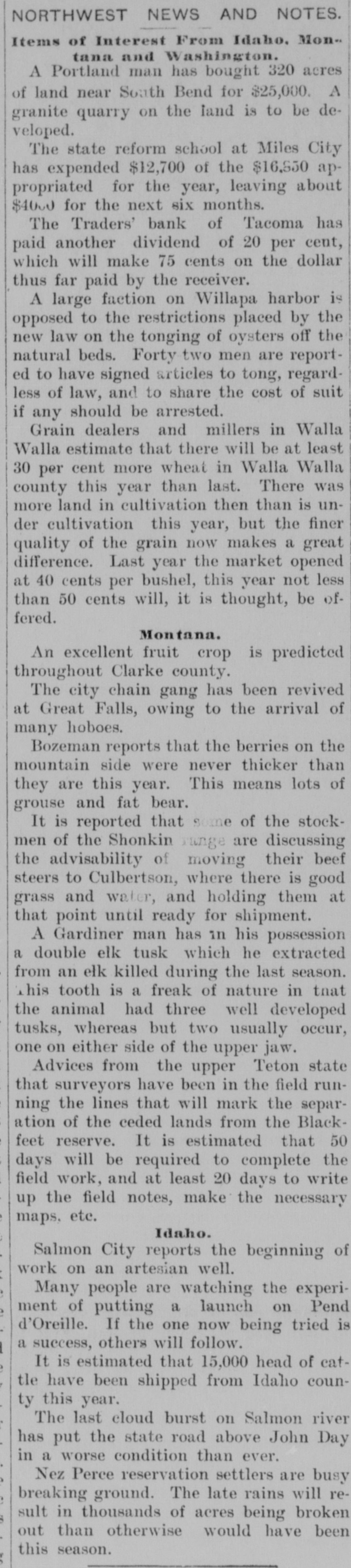 # NORTHWEST NEWS AND NOTES. Items of Interest From Idaho, Montana and Washington. A Portland man has bought 320 acres of land near South Bend for $25,000. A granite quarry on the land is to be developed. The state reform school at Miles City has expended $12,700 of the $16,550 appropriated for the year, leaving about $4000 for the next six months. The Traders' bank of Tacoma has paid another dividend of 20 per cent, which will make 75 cents on the dollar thus far paid by the receiver. A large faction on Willapa harbor is opposed to the restrictions placed by the new law on the tonging of oysters off the natural beds. Forty two men are reported to have signed articles to tong, regardless of law, and to share the cost of suit if any should be arrested. Grain dealers and millers in Walla Walla estimate that there will be at least 30 per cent more wheat in Walla Walla county this year than last. There was more land in cultivation then than is under cultivation this year, but the finer quality of the grain now makes a great difference. Last year the market opened at 40 cents per bushel, this year not less than 50 cents will, it is thought, be offered. # Montana. An excellent fruit crop is predicted throughout Clarke county. The city chain gang has been revived at Great Falls, owing to the arrival of many hoboes. Bozeman reports that the berries on the mountain side were never thicker than they are this year. This means lots of grouse and fat bear. It is reported that some of the stockmen of the Shonkin range are discussing the advisability of moving their beef steers to Culbertson, where there is good grass and water, and holding them at that point until ready for shipment. A Gardiner man has in his possession a double elk tusk which he extracted from an elk killed during the last season. This tooth is a freak of nature in that the animal had three well developed tusks, whereas but two usually occur, one on either side of the upper jaw. Advices from the upper Teton state that surveyors have been in the field running the lines that will mark the separ-ation of the ceded lands from the Black-feet reserve. It is estimated that 50 days will be required to complete the field work, and at least 20 days to write up the field notes, make the necessary maps, etc. # Idaho. Salmon City reports the beginning of work on an artesian well. Many people are watching the experiment of putting a launch on Pend d'Oreille. If the one now being tried is a success, others will follow. It is estimated that 15,000 head of cattle have been shipped from Idaho county this year. The last cloud burst on Salmon river has put the state road above John Day in a worse condition than ever. Nez Perce reservation settlers are busy breaking ground. The late rains will result in thousands of acres being broken out than otherwise would have been this season.