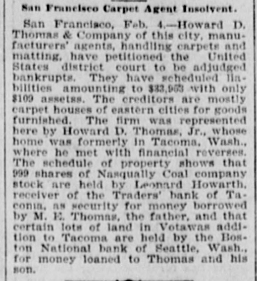 San Francisco Carpet Agent Insolvent. San Francisco, Feb. 4.-Howard D. Thomas & Company of this city, manufacturers' agents, handling carpets and matting, have petitioned the United States district court to be adjudged bankrupts. They have scheduled liabilities amounting to $33,963 with only $109 assetss. The creditors are mostly carpet houses of eastern cities for goods furnished. The firm was represented here by Howard D. Thomas, Jr., whose home was formerly in Tacoma, Wash., where he met with financial reverses. The schedule of property shows that 999 shares of Nasqually Coal company stock are held by Leonard Howarth, receiver of the Traders' bank of Taconia. as security for money borrowed by M. E. Thomas. the father, and that certain lots of land in Votawas addition to Tacoma are held by the Boston National bank of Seattle, Wash., for money loaned to Thomas and his son.