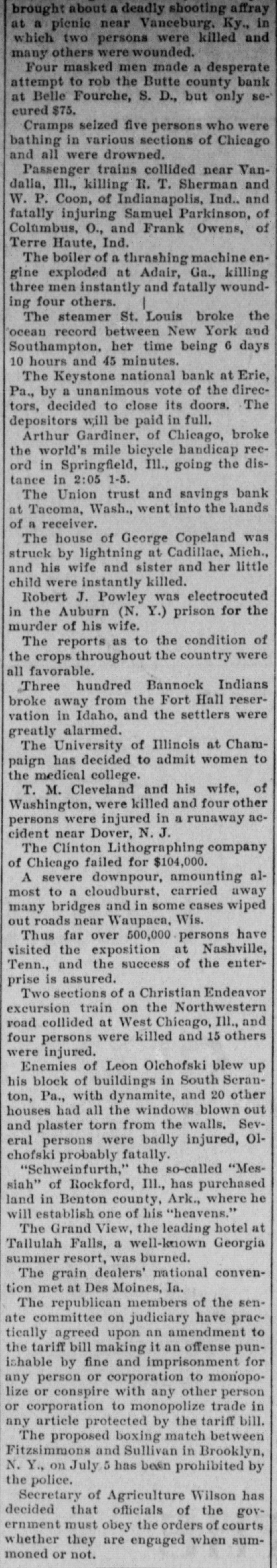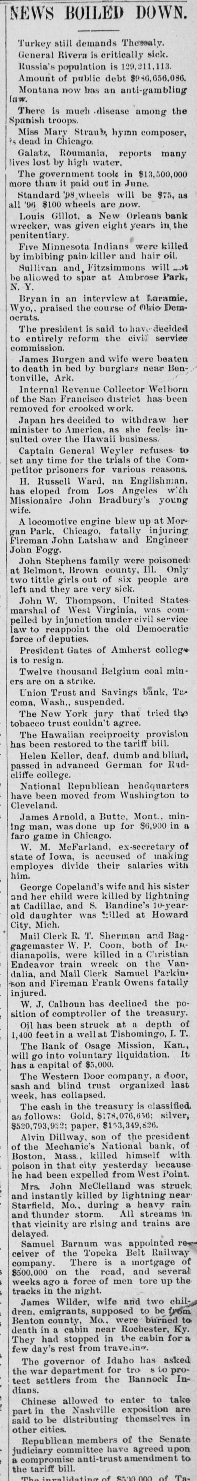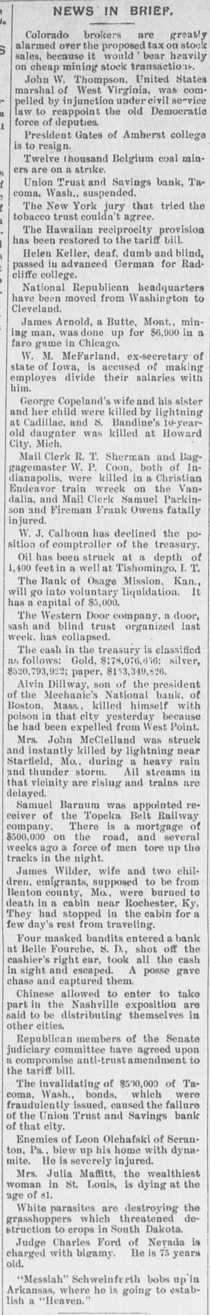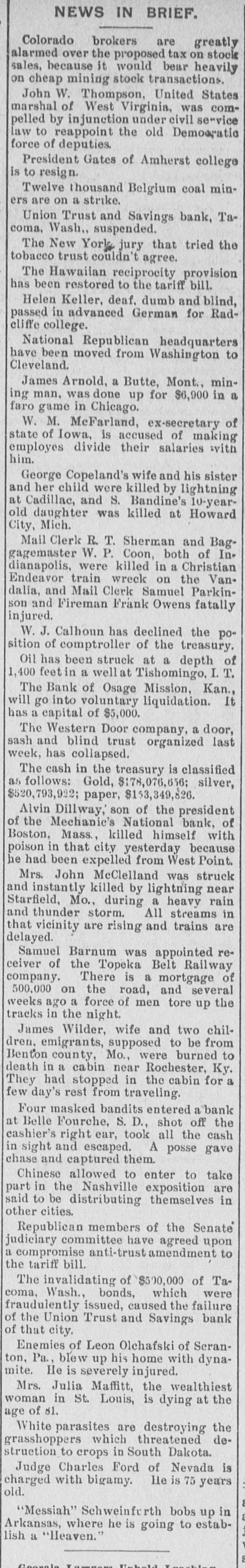 NEWS IN BRIEF. Colorado brokers are greatly alarmed over the proposed tax on stock sales, because it would bear heavily on cheap mining stock transactions. John W. Thompson, United States marshal of West Virginia, was compelled by injunction under civil service law to reappoint the old Democratic force of deputies. President Gates of Amherst college is to resign. Twelve thousand Belgium coal miners are on a strike. Union Trust and Savings bank, Tacoma, Wash,, suspended. The New York jury that tried the tobacco trust couldn't agree. The Hawaiian reciprocity provision has been restored to the tariff bill. Helen Keller, deaf, dumb and blind, passed in advanced German for Radcliffe college. National Republican headquarters have been moved from Washington to Cleveland. James Arnold, a Butte, Mont., mining man, was done up for $6,900 in a faro game in Chicago. W. M. McFarland, ex-secretary of state of Iowa, is accused of making employes divide their salaries with him. George Copeland's wife and his sister and her child were killed by lightning at Cadillac, and S. Bandine's 10-yearold daughter was killed at Howard City, Mich. Mail Clerk R. T. Sherman and Baggagemaster W. P. Coon, both of Indianapolis, were killed in a Christian Endeavor train wreck on the Vandalia, and Mail Clerk Samuel Parkinson and Fireman Frank Owens fatally injured. W. J. Calhoun has declined the position of comptroller of the treasury. Oil has been struck at a depth of 1,400 feet in a well at Tishomingo, I. T. The Bank of Osage Mission, Kan., will go into voluntary liquidation. It has a capital of $5,000. The Western Door company, a door, sash and blind trust organized last week, has collapsed. The cash in the treasury is classified as follows: Gold, $178,076,656; silver, $520,793,922; paper, $153,349,826. Alvin Dillway,' son of the president of the Mechanic's National bank, of Boston, Mass., killed himself with poison in that city yesterday because he had been expelled from West Point. Mrs. John McClelland was struck and instantly killed by lightning near Starfield, Mo., during a heavy rain and thunder storm. All streams in that vicinity are rising and trains are delayed. Samuel Barnum was appointed receiver of the Topeka Belt Railway company. There is a mortgage of 500,000 on the road, and several weeks ago a force of men tore up the tracks in the night. James Wilder, wife and two children, emigrants, supposed to be from Benton county, Mo., were burned to death in a cabin near Rochester, Ky. They had stopped in the cabin for a few day's rest from traveling. Four masked bandits entered a bank at Belle Fourche, S. D., shot off the cashier's right ear, took all the cash in sight and escaped. A posse gave chase and captured them. Chinese allowed to enter to take part in the Nashville exposition are said to be distributing themselves in other cities. Republican members of the Senate judiciary committee have agreed upon a compromise anti-trust amendment to the tariff bill. The invalidating of $500,000 of Tacoma, Wash., bonds, which were fraudulently issued, caused the failure of the Union Trust and Savings bank of that city. Enemies of Leon Olchafski of Scranton, Pa., blew up his home with dynamite. He is severely injured. Mrs. Julia Maffitt, the wealthiest woman in St. Louis, is dying at the age of 81. White parasites are destroying the grasshoppers which threatened destruction to crops in South Dakota. Judge Charles Ford of Nevada is charged with bigamy. lie is 75 years old. "Messiah" Schweinfurth bobs up in Arkansas, where he is going to establish a "Heaven." Georgia