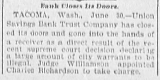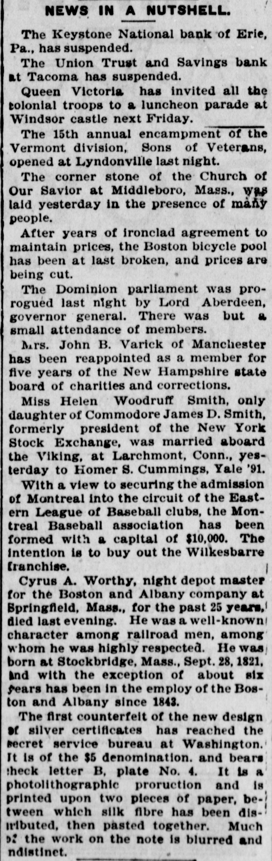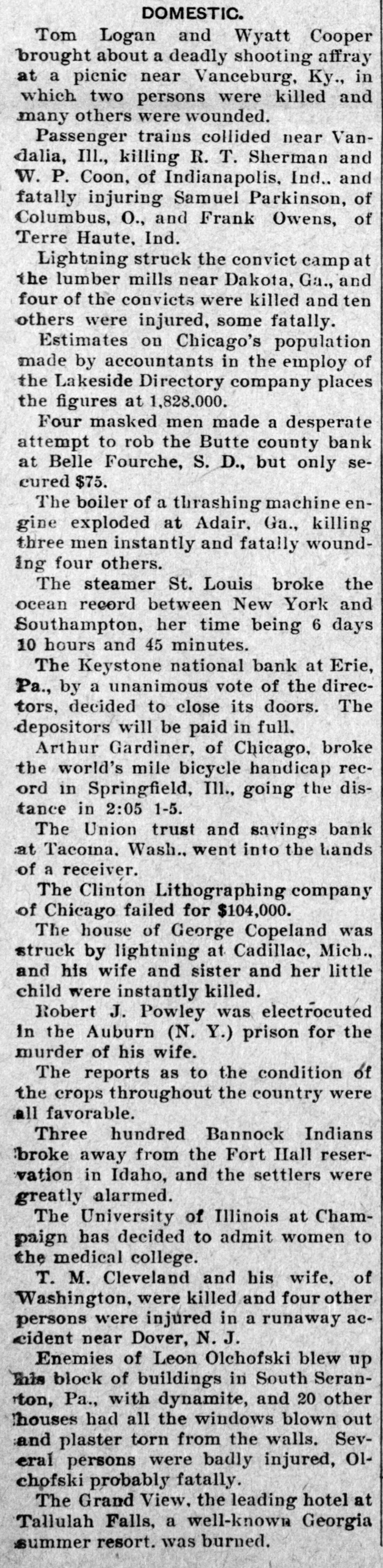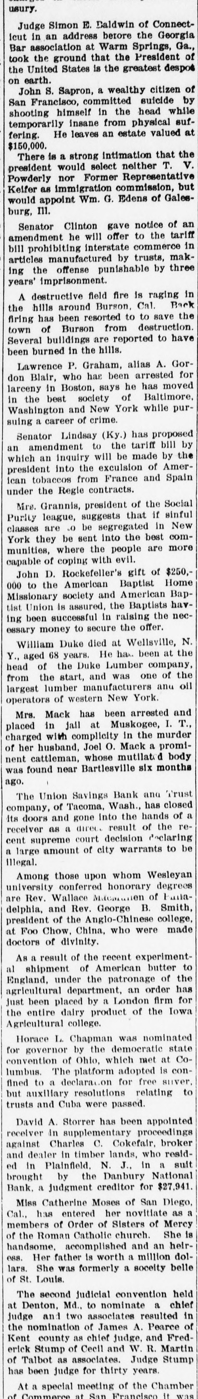 NEWS IN BRIEF. Colorado brokers are greatly alarmed over the proposed tax on stock sales, because it would bear heavily on cheap mining stock transactions. John W. Thompson, United States marshal of West Virginia, was compelled by injunction under civil service law to reappoint the old Democratic force of deputies. President Gates of Amherst college is to resign. Twelve thousand Belgium coal miners are on a strike. Union Trust and Savings bank, Tacoma, Wash,, suspended. The New York jury that tried the tobacco trust couldn't agree. The Hawaiian reciprocity provision has been restored to the tariff bill. Helen Keller, deaf, dumb and blind, passed in advanced German for Radcliffe college. National Republican headquarters have been moved from Washington to Cleveland. James Arnold, a Butte, Mont., mining man, was done up for $6,900 in a faro game in Chicago. W. M. McFarland, ex-secretary of state of Iowa, is accused of making employes divide their salaries with him. George Copeland's wife and his sister and her child were killed by lightning at Cadillac, and S. Bandine's 10-yearold daughter was killed at Howard City, Mich. Mail Clerk R. T. Sherman and Baggagemaster W. P. Coon, both of Indianapolis, were killed in a Christian Endeavor train wreck on the Vandalia, and Mail Clerk Samuel Parkinson and Fireman Frank Owens fatally injured. W. J. Calhoun has declined the position of comptroller of the treasury. Oil has been struck at a depth of 1,400 feet in a well at Tishomingo, I. T. The Bank of Osage Mission, Kan., will go into voluntary liquidation. It has a capital of $5,000. The Western Door company, a door, sash and blind trust organized last week, has collapsed. The cash in the treasury is classified as follows: Gold, $178,076,656; silver, $520,793,922; paper, $153,349,826. Alvin Dillway,' son of the president of the Mechanic's National bank, of Boston, Mass., killed himself with poison in that city yesterday because he had been expelled from West Point. Mrs. John McClelland was struck and instantly killed by lightning near Starfield, Mo., during a heavy rain and thunder storm. All streams in that vicinity are rising and trains are delayed. Samuel Barnum was appointed receiver of the Topeka Belt Railway company. There is a mortgage of 500,000 on the road, and several weeks ago a force of men tore up the tracks in the night. James Wilder, wife and two children, emigrants, supposed to be from Benton county, Mo., were burned to death in a cabin near Rochester, Ky. They had stopped in the cabin for a few day's rest from traveling. Four masked bandits entered a bank at Belle Fourche, S. D., shot off the cashier's right ear, took all the cash in sight and escaped. A posse gave chase and captured them. Chinese allowed to enter to take part in the Nashville exposition are said to be distributing themselves in other cities. Republican members of the Senate judiciary committee have agreed upon a compromise anti-trust amendment to the tariff bill. The invalidating of $500,000 of Tacoma, Wash., bonds, which were fraudulently issued, caused the failure of the Union Trust and Savings bank of that city. Enemies of Leon Olchafski of Scranton, Pa., blew up his home with dynamite. He is severely injured. Mrs. Julia Maffitt, the wealthiest woman in St. Louis, is dying at the age of 81. White parasites are destroying the grasshoppers which threatened destruction to crops in South Dakota. Judge Charles Ford of Nevada is charged with bigamy. lie is 75 years old. "Messiah" Schweinfurth bobs up in Arkansas, where he is going to establish a "Heaven." Georgia