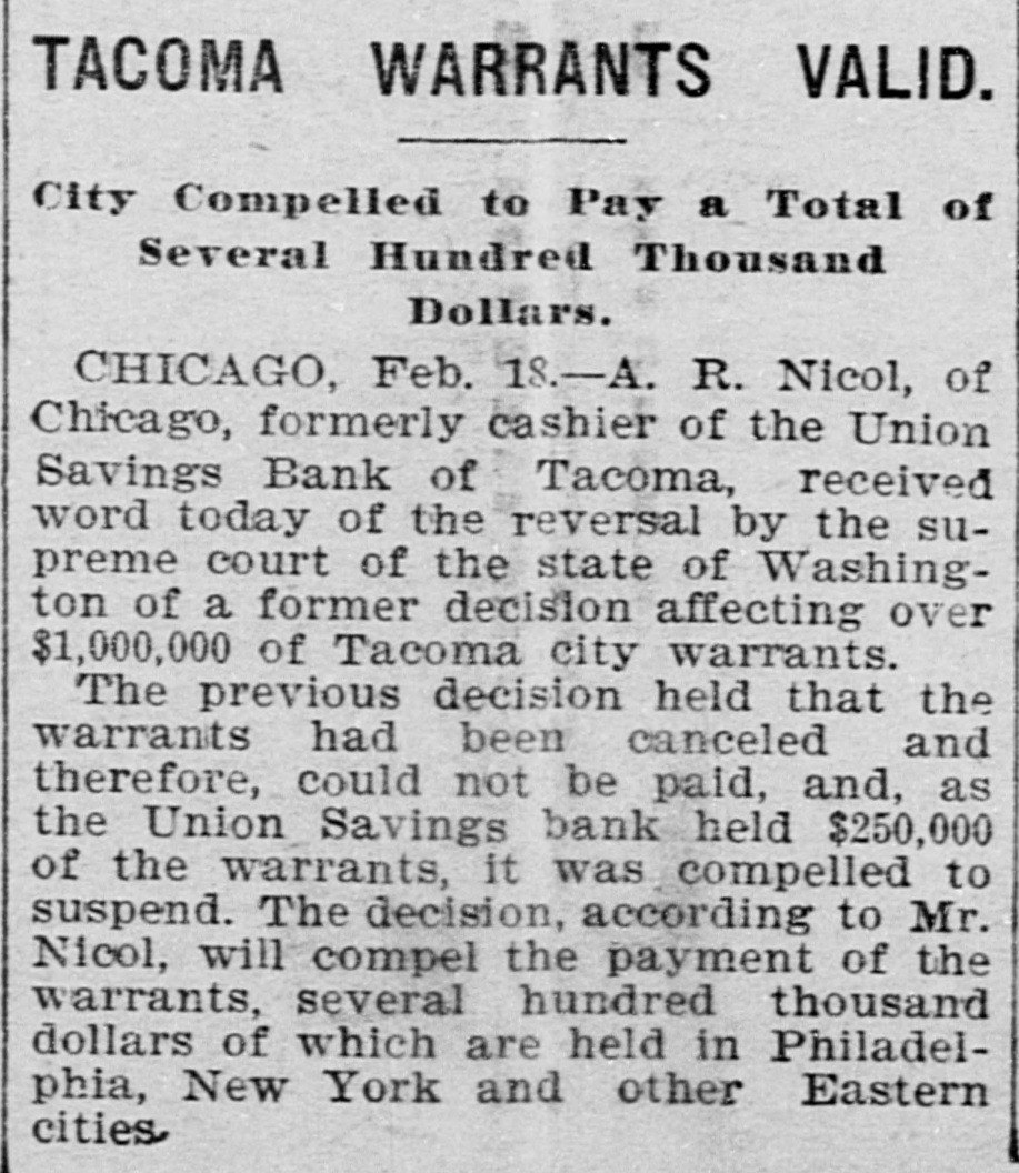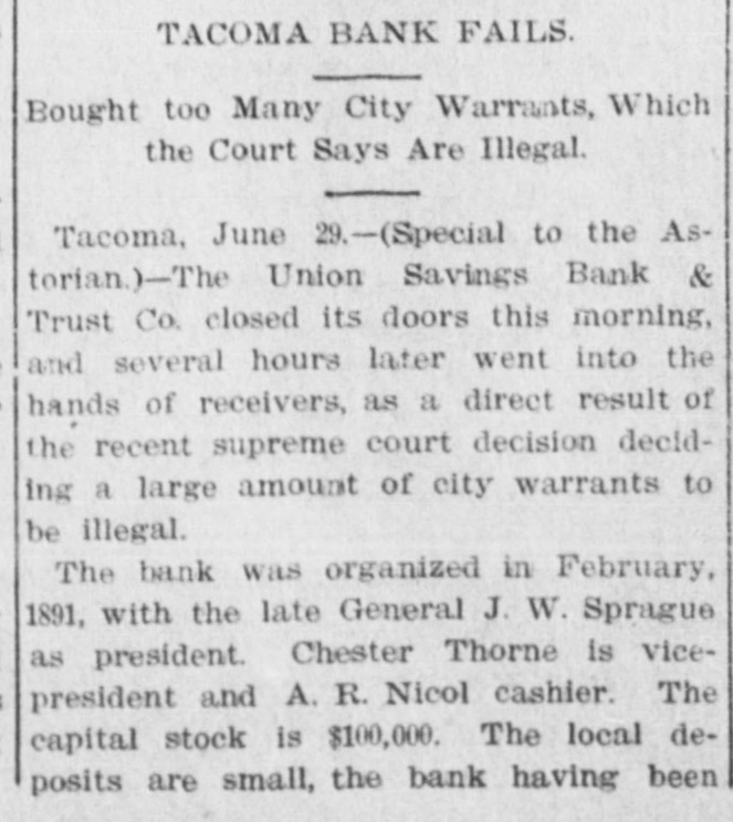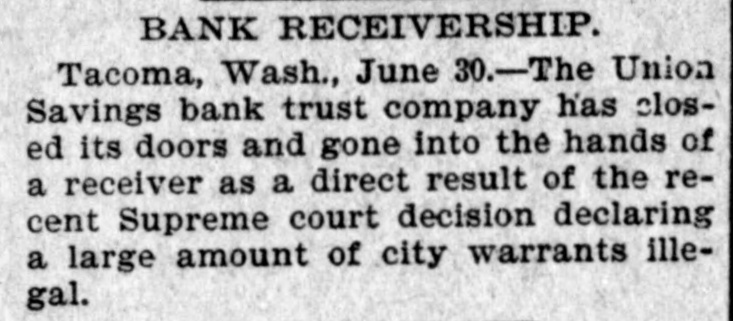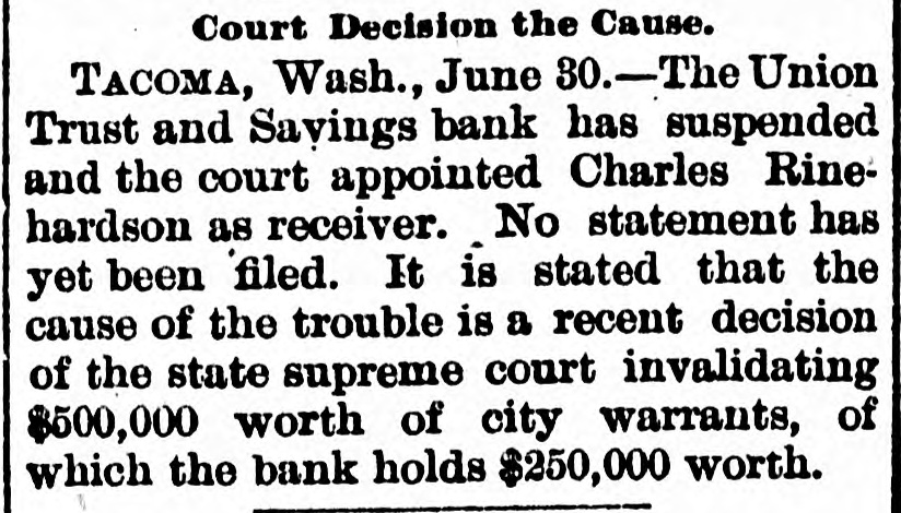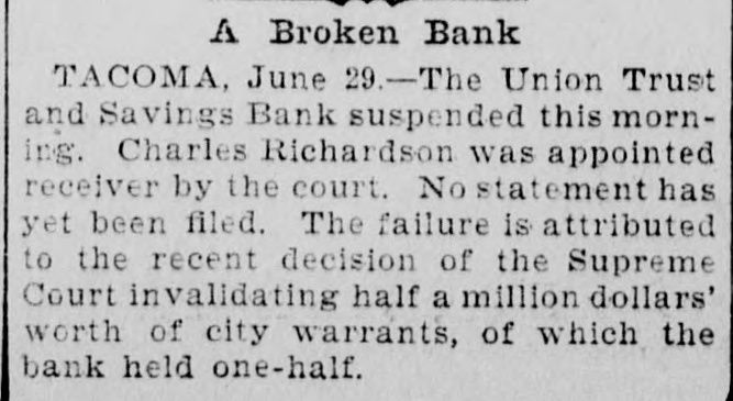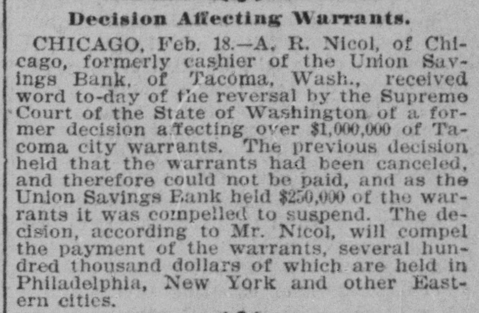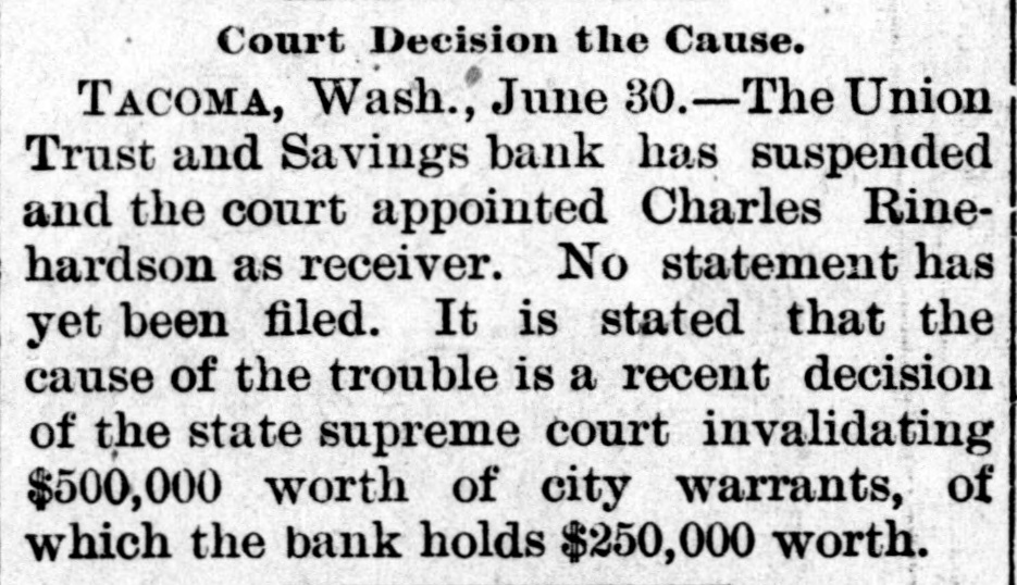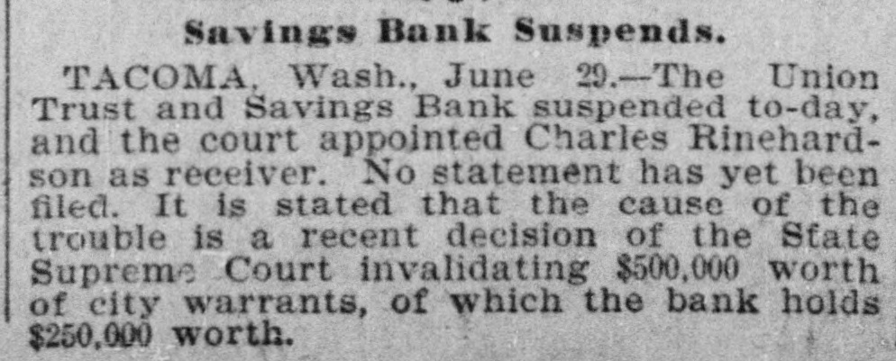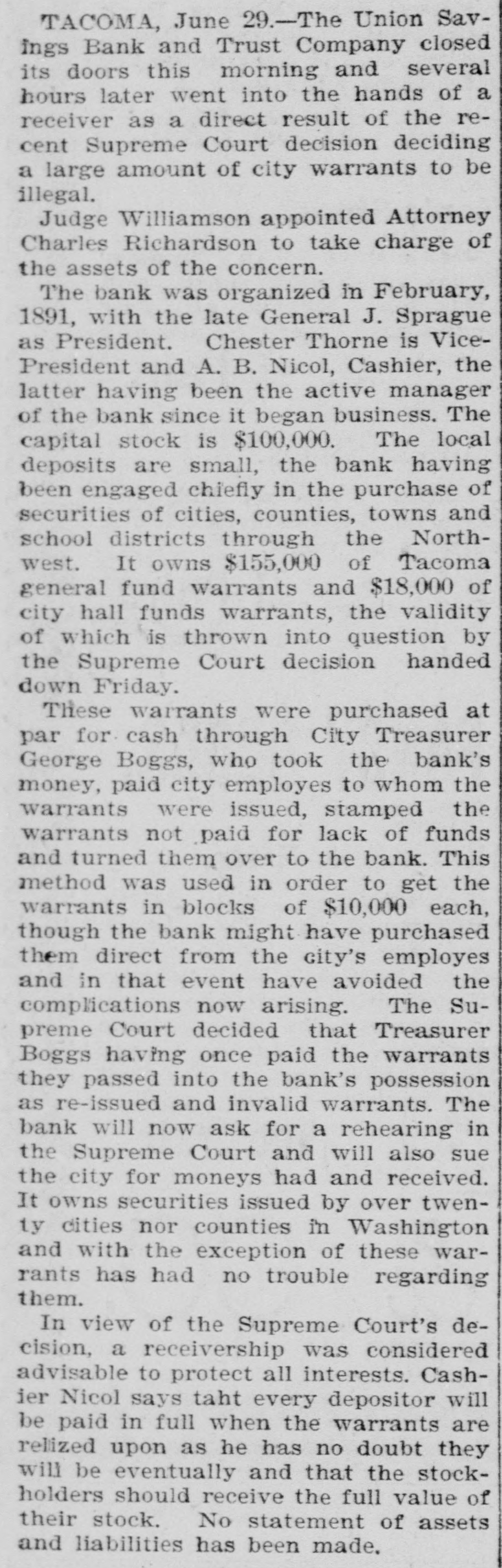 NEWS IN BRIEF. Colorado brokers are greatly alarmed over the proposed tax on stock sales, because it would bear heavily on cheap mining stock transactions. John W. Thompson, United States marshal of West Virginia, was compelled by injunction under civil service law to reappoint the old Democratic force of deputies. President Gates of Amherst college is to resign. Twelve thousand Belgium coal miners are on a strike. Union Trust and Savings bank, Tacoma, Wash,, suspended. The New York jury that tried the tobacco trust couldn't agree. The Hawaiian reciprocity provision has been restored to the tariff bill. Helen Keller, deaf, dumb and blind, passed in advanced German for Radcliffe college. National Republican headquarters have been moved from Washington to Cleveland. James Arnold, a Butte, Mont., mining man, was done up for $6,900 in a faro game in Chicago. W. M. McFarland, ex-secretary of state of Iowa, is accused of making employes divide their salaries with him. George Copeland's wife and his sister and her child were killed by lightning at Cadillac, and S. Bandine's 10-yearold daughter was killed at Howard City, Mich. Mail Clerk R. T. Sherman and Baggagemaster W. P. Coon, both of Indianapolis, were killed in a Christian Endeavor train wreck on the Vandalia, and Mail Clerk Samuel Parkinson and Fireman Frank Owens fatally injured. W. J. Calhoun has declined the position of comptroller of the treasury. Oil has been struck at a depth of 1,400 feet in a well at Tishomingo, I. T. The Bank of Osage Mission, Kan., will go into voluntary liquidation. It has a capital of $5,000. The Western Door company, a door, sash and blind trust organized last week, has collapsed. The cash in the treasury is classified as follows: Gold, $178,076,656; silver, $520,793,922; paper, $153,349,826. Alvin Dillway,' son of the president of the Mechanic's National bank, of Boston, Mass., killed himself with poison in that city yesterday because he had been expelled from West Point. Mrs. John McClelland was struck and instantly killed by lightning near Starfield, Mo., during a heavy rain and thunder storm. All streams in that vicinity are rising and trains are delayed. Samuel Barnum was appointed receiver of the Topeka Belt Railway company. There is a mortgage of 500,000 on the road, and several weeks ago a force of men tore up the tracks in the night. James Wilder, wife and two children, emigrants, supposed to be from Benton county, Mo., were burned to death in a cabin near Rochester, Ky. They had stopped in the cabin for a few day's rest from traveling. Four masked bandits entered a bank at Belle Fourche, S. D., shot off the cashier's right ear, took all the cash in sight and escaped. A posse gave chase and captured them. Chinese allowed to enter to take part in the Nashville exposition are said to be distributing themselves in other cities. Republican members of the Senate judiciary committee have agreed upon a compromise anti-trust amendment to the tariff bill. The invalidating of $500,000 of Tacoma, Wash., bonds, which were fraudulently issued, caused the failure of the Union Trust and Savings bank of that city. Enemies of Leon Olchafski of Scranton, Pa., blew up his home with dynamite. He is severely injured. Mrs. Julia Maffitt, the wealthiest woman in St. Louis, is dying at the age of 81. White parasites are destroying the grasshoppers which threatened destruction to crops in South Dakota. Judge Charles Ford of Nevada is charged with bigamy. lie is 75 years old. "Messiah" Schweinfurth bobs up in Arkansas, where he is going to establish a "Heaven." Georgia