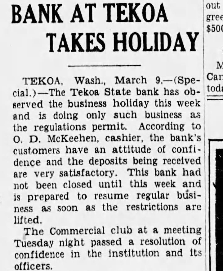 BANK AT TEKOA TAKES HOLIDAY today. Tekoa State bank has served the business holiday this and doing only such business the According McKeehen. cashier, the bank's have attitude confidence and the deposits received satisfactory. This bank had closed prepared to resume regular business soon the restrictions are lifted. The Commercial club meeting Tuesday night passed resolution the institution and its confidence officers.