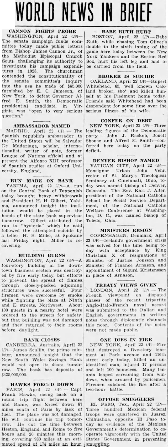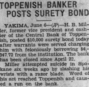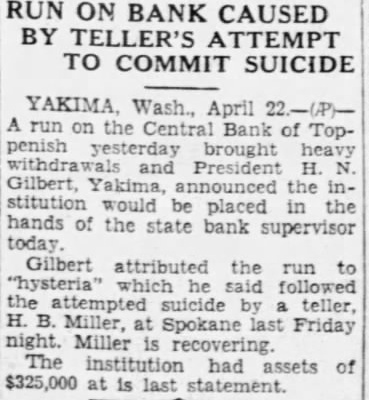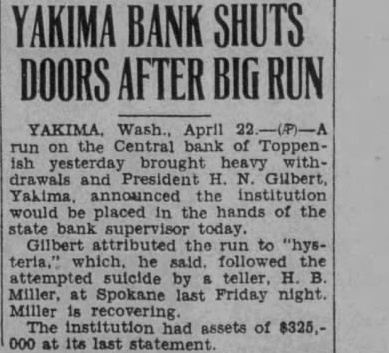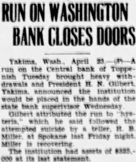 RUN MADE ON BANK April the Central Bank of Toppenish today brought heavy withdrawals and President Gilbert, announced tonight the institution would placed in the hands of the state bank supervisor tomorrow Gilbert attributed the to "hysteria" which he said followed the attempted suicide by Miller, Spokane last Friday night. Miller covering.