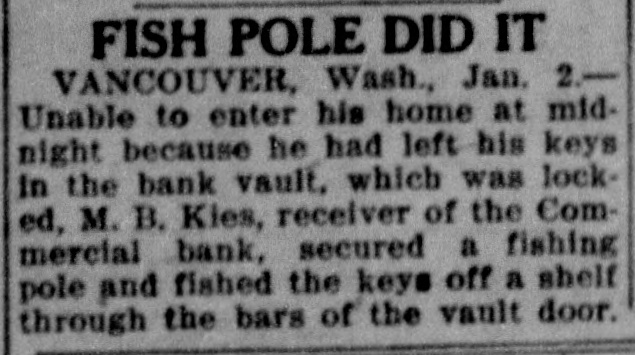 FISH POLE DID IT VANCOUVER, Wash., Jan. 2Unable to enter his home at midnight because he had left his keys in the bank vault, which was locked, M. B. Kies, receiver of the Commercial bank, secured a fishing pole and fished the keys off a shelf through the bars of the vault door.