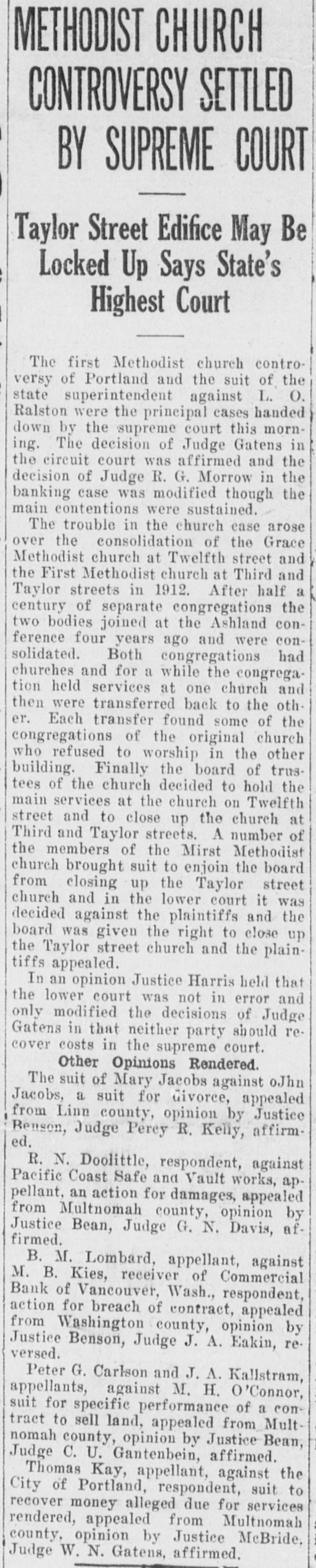 METHODIST CHURCH CONTROVERSY SETTLED BY SUPREME COURT Taylor Street Edifice May Be Locked Up Says State's Highest Court The first Methodist church controversy of Portland and the suit of the state superintendent against L. O. Ralston were the principal cases handed down by the supreme court this morning. The decision of Judge Gatens in the circuit court was affirmed and the decision of Judge R. G. Morrow in the banking case was modified though the main contentions were sustained. The trouble in the church case arose over the consolidation of the Grace Methodist church at Twelfth street and the First Methodist church at Third and Taylor streets in 1912. After half a century of separate congregations the two bodies joined at the Ashland conference four years ago and were consolidated. Both congregations had churches and for a while the congregation held services at one church and then were transferred back to the oth. er. Each transfer found some of the congregations of the original church who refused to worship in the other building. Finally the board of trustees of the church decided to hold the main services at the church on Twelfth street and to close up the church at Third and Taylor streets. A number of the members of the Mirst Methodist church brought suit to enjoin the board from closing up the Taylor street church and in the lower court it was decided against the plaintiffs and the board was given the right to close up the Taylor street church and the plaintiffs appealed. In an opinion Justice Harris held that the lower court was not in error and only modified the decisions of Judge Gatens in that neither party should recover costs in the supreme court. Other Opinions Rendered. The suit of Mary Jacobs against oJhn Jacobs, a suit for Givorce, appealed from Linn county, opinion by Justice Renson, Judge Perey R. Kelly, affirmed. R. N. Doolittle, respondent, against Pacific Coast Safe and Vault works, appellant, an action for damages, appealed from Multnomah county, opinion by Justice Bean, Judge G. N. Davis, affirmed. B. M. Lombard, appellant, against M. B. Kies, receiver of Commercial Bank of Vancouver, Wash., respondent, action for breach of contract, appealed from Washington county, opinion by Justice Benson, Judge J. A. Eakin, reversed. Peter G. Carlson and J. A. Kallstram, appellants, against M. H. O'Connor, suit for specific performance of a contract to sell land, appealed from Multnomah county, opinion by Justice Bean, Judge C. U. Gantenbein, affirmed. Thomas Kay, appellant, against the City of Portland, respondent, suit to recover money alleged due for services rendered, appealed from Multnomah county, opinion by Justice McBride. Judge W. N. Gatens, affirmed.