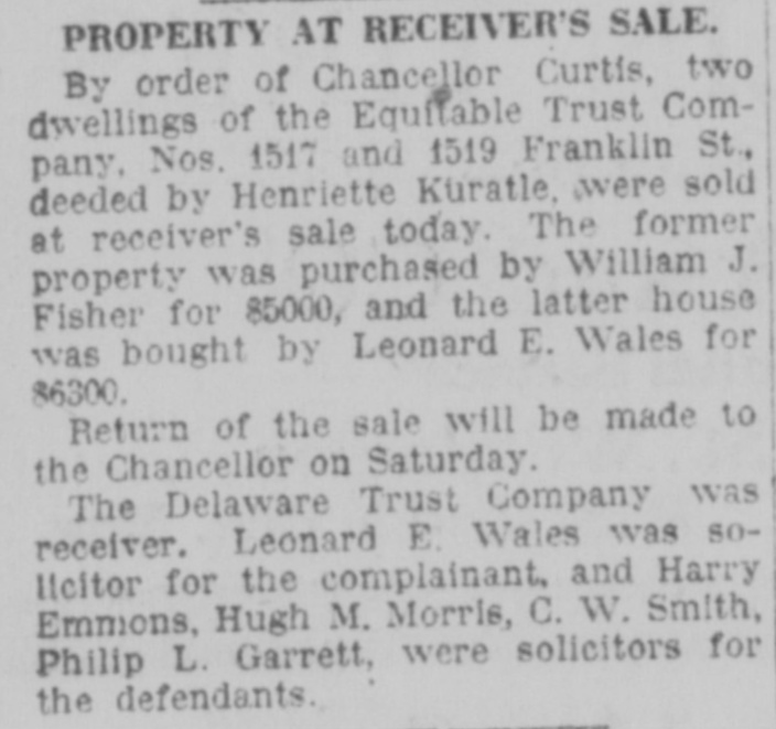 PROPERTY AT RECEIVER'S SALE. By order of Chancellor Curtis, two dwellings of the Equitable Trust Company, Nos. 1517 and 1519 Franklin St., deeded by Henriette Kuratle, were sold at receiver's sale today. The former property was purchased by William J. Fisher for 85000, and the latter house was bought by Leonard E. Wales for $6300. Return of the sale will be made to the Chancellor on Saturday. The Delaware Trust Company was receiver. Leonard E. Wales was solicitor for the complainant, and Harry Emmons, Hugh M. Morris, C. W. Smith, Philip L. Garrett, were solicitors for the defendants.