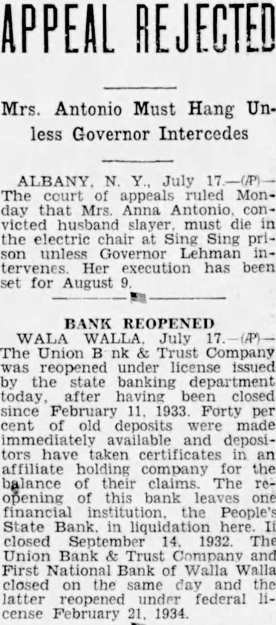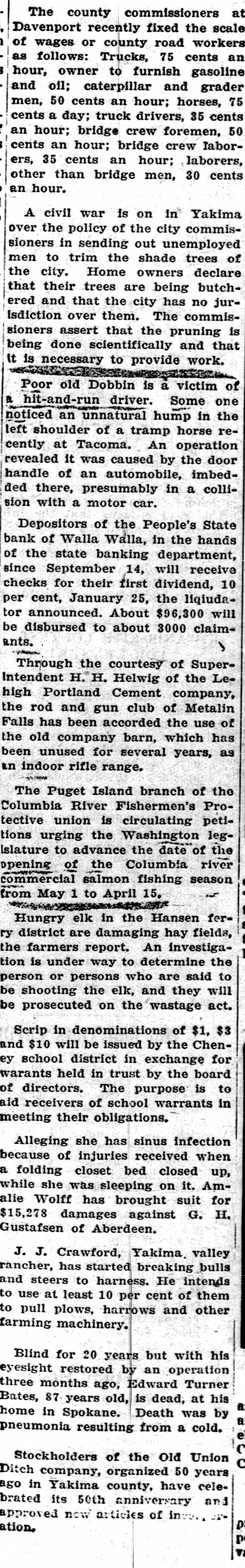 The county commissioners at Davenport recently fixed the scale of wages or county road workers as follows: Trucks, 75 cents an hour, owner to furnish gasoline and oil; caterpillar and grader men, 50 cents an hour; horses, 75 cents a day; truck drivers, 35 cents an hour; bridge crew foremen, 50 cents an hour; bridge crew Iaborers, 35 cents an hour; laborers, other than bridge men, 30 cents an hour. A civil war is on in Yakima over the policy of the city commissioners in sending out unemployed men to trim the shade trees of the city. Home owners declare that their trees are being butchered and that the city has no jurisdiction over them. The commissioners assert that the pruning is being done scientifically and that It is necessary to provide work. Poor old Dobbin is a victim of a hit-and-run driver. Some one noticed an unnatural hump in the left shoulder of a tramp horse recently at Tacoma. An operation revealed it was caused by the door handle of an automobile, imbedded there, presumably in a collision with a motor car. Depositors of the People's State bank of Walla Walla, in the hands of the state banking department, since September 14, will receive checks for their first dividend, 10 per cent, January 25, the liqiudator announced. About $96,300 will be disbursed to about 3000 claimants. Through the courtesy of SuperIntendent H. H. Helwig of the Lehigh Portland Cement company, the rod and gun club of Metalin Falls has been accorded the use of the old company barn, which has been unused for several years, as an indoor rifle range. The Puget Island branch of the Columbia River Fishermen's Protective union is circulating petitions urging the Washington legIslature to advance the date of the opening of the Columbia river commercial salmon fishing season from May 1 to April 15. Hungry elk in the Hansen ferry district are damaging hay fields, the farmers report. An investigation is under way to determine the person or persons who are said to be shooting the elk, and they will be prosecuted on the wastage act. Scrip in denominations of $1, $3 and $10 will be issued by the Cheney school district in exchange for warants held in trust by the board of directors. The purpose is to aid receivers of school warrants in meeting their obligations. Alleging she has sinus infection because of injuries received when a folding closet bed closed up, while she was sleeping on it. Amalie Wolff has brought suit for $15,278 damages against G. H. Gustafsen of Aberdeen. J. J. Crawford, Yakima. valley rancher, has started breaking bulls and steers to harness. He intends to use at least 10 per cent of them to pull plows, harrows and other farming machinery. Blind for 20 years but with his eyesight restored by an operation three months ago, Edward Turner Bates, 87 years old, is dead, at his a home in Spokane. Death was by a pneumonia resulting from a cold. e C Stockholders of the Old Union C Ditch company, organized 50 years ago in Yakima county, have celebrated its 50th anniversary and approved now articles of in D ation. p V