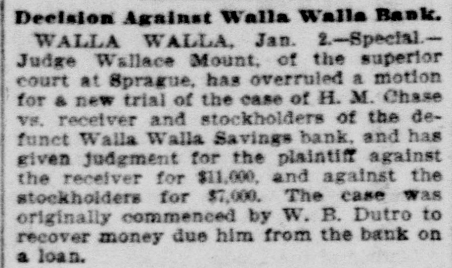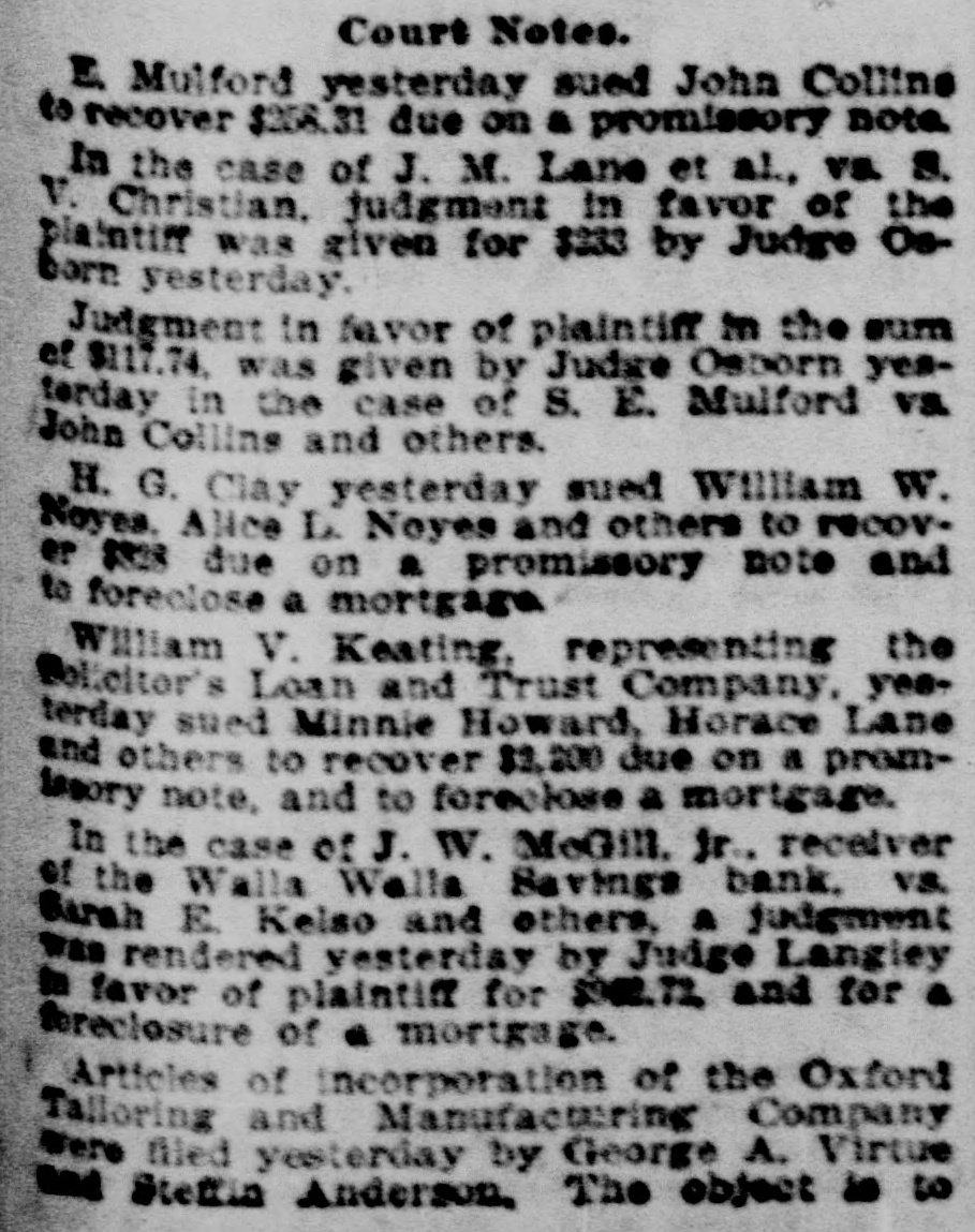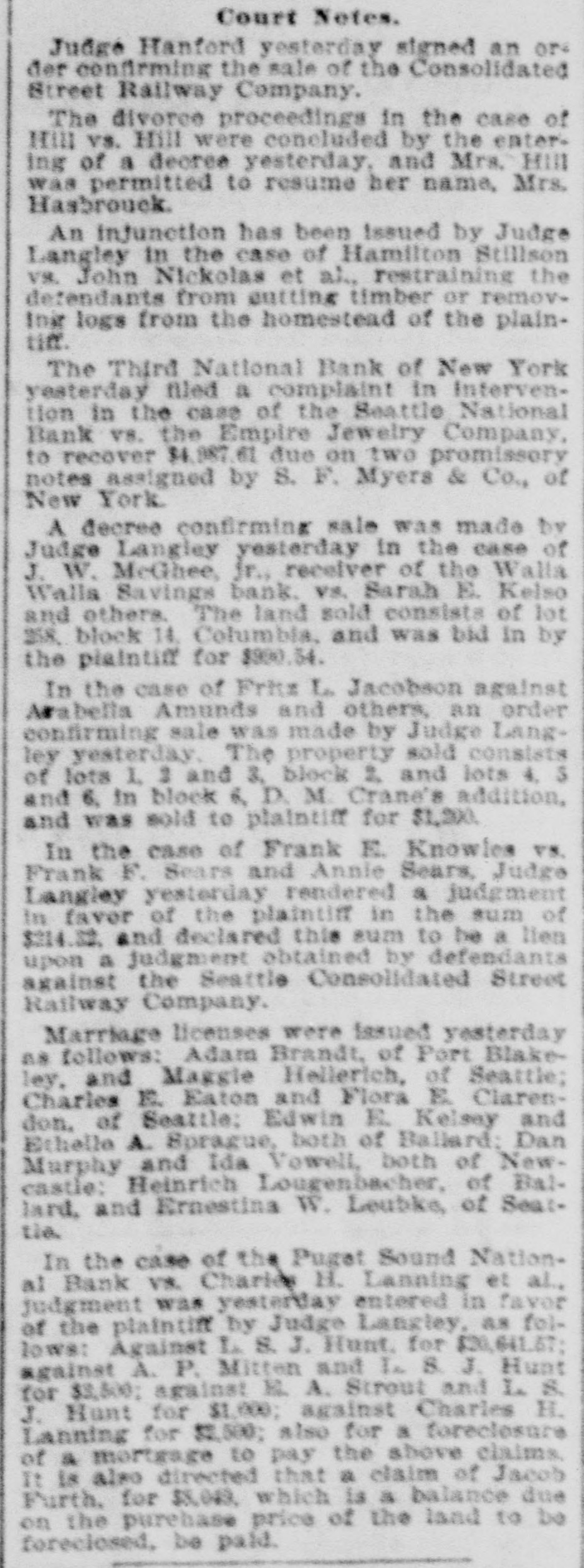 Court Notes. Judge Hanford yesterday signed an or der confirming the sale of the Consolidated Street Railway Company. The divorce proceedings in the case of Hill vs. Hill were concluded by the entering of a decree yesterday, and Mrs. Hill was permitted to resume her name, Mrs. Hasbrouck. An injunction has been Issued by Judge Langley in the case of Hamilton Stillson VR. John Nickolas et al., restraining the defendants from outting timber or removInit logs from the homestead of the plaintim. The Third National Bank of New York yesterday filed a complaint in Intervention in the case of the Seattle National Bank vs. the Empire Jewelry Company, to recover $4,987.61 due on two promissory notes assigned by 8. F. Myers & Co., of New York A decree confirming sale was made by Judge Langley yesterday in the case of J. W. McGhee, Jr., receiver of the Walla Walla Savings bank. vs. Sarah E. Kelso and others. The land sold consists of lot 258, block 14. Columbia, and was bid in by the plaintiff for $990.54. In the case of Fritz L. Jacobson against Arabella Amunds and others, an order confirming sale was made by Judge Langley yesterday. The property sold consists of lots 1, 2 and 3, block 2. and lots 4, $ and 6, in block 6, D. M. Crane's addition, and was sold to plaintiff for $1,200. In the case of Frank E. Knowles vs. Frank F. Sears and Annie Sears, Judge Langley yesterday rendered a judgment in favor of the plaintiff in the sum of $214.32. and declared this sum to be a lien upon a judgment obtained by defendants against the Seattle Consolidated Street Railway Company. Marriage licenses were issued yesterday as follows: Adam Brandt, of Port Blakeley, and Maggie Hellerich, of Seattle; Charles E. Eaton and Flora E. Clarendon. of Seattle: Edwin E. Kelsey and Ethelle A. Sprague, both of Ballard: Dan Murphy and Ida Vowell, both of Newcastle: Heinrich Lougenbacher, of Ballard, and Ernestina W. Leubke, of Seattia. In the case of the Puget Sound National Bank vs. Charles H. Lanning et al., judgment was yesterday entered in favor of the plaintiff by Judge Langley, as follows: Against L 8. J. Hunt. for $30,641.67; against À. P. Mitten and L 8. J. Hunt for $3,500; against E. A. Strout and L 8. J. Hunt for $1,000; against Charles H. Lanning for $2,500; also for a foreclesure of & mortgage to pay the above claims. It is also directed that a claim of Jacob Furth, for $8,049, which is a balance due on the purchase price of the land to be foreclosed, be paid.