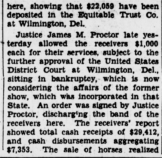 here, showing that $22,059 have been deposited in the Equitable Trust Co. at Wilmington, Del. Justice James M. Proctor late yesterday allowed the receivers $1,000 each for their services, subject to the further approval of the United States District Court at Wilmington, Del., sitting in bankruptcy, which is now considering the affairs of the former show, which was incorporated in that State. An order was signed by Justice Proctor, discharging the band of the receivers here. The receivers' report showed total cash receipts of $29,412, and cash disbursements aggregating $7,353. The sale of horses realized