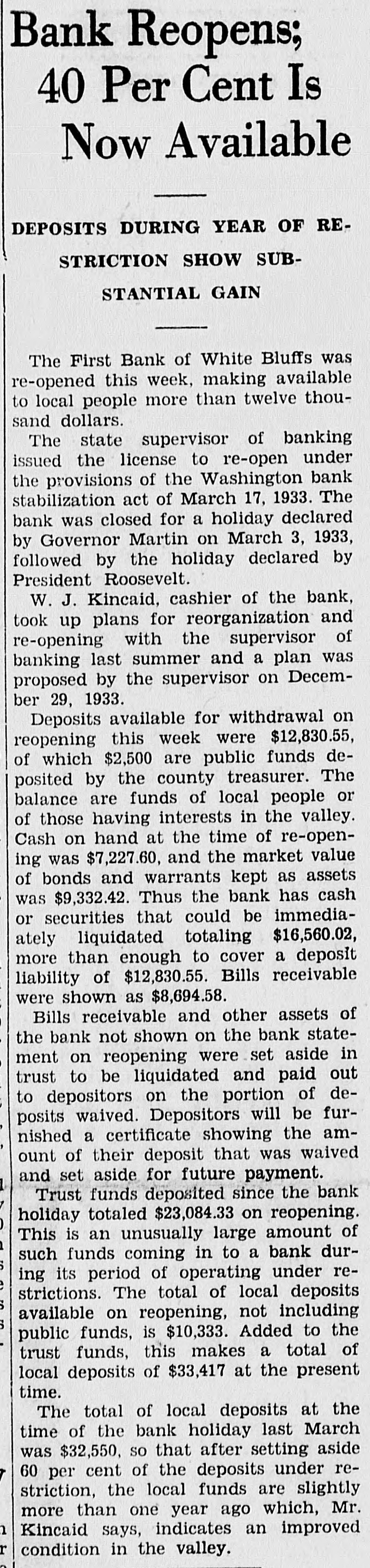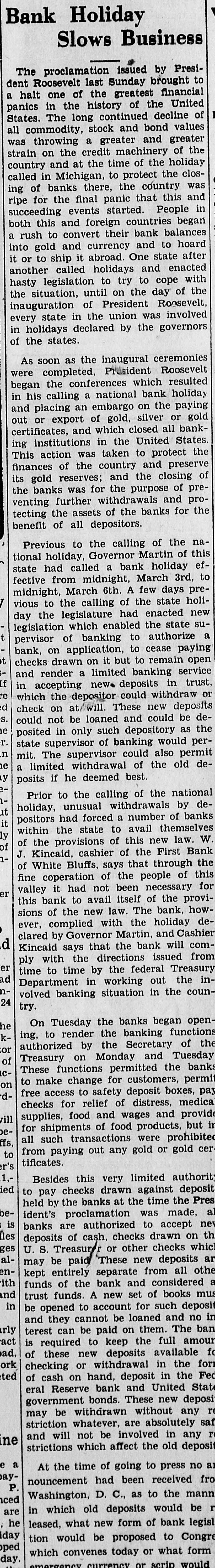 # Bank Holiday # Slows Business The proclamation issued by President Roosevelt last Sunday brought to a halt one of the greatest financial panics in the history of the United States. The long continued decline of all commodity, stock and bond values was throwing a greater and greater strain on the credit machinery of the country and at the time of the holiday called in Michigan, to protect the closing of banks there, the country was ripe for the final panic that this and succeeding events started. People in both this and foreign countries began a rush to convert their bank balances into gold and currency and to hoard it or to ship it abroad. One state after another called holidays and enacted hasty legislation to try to cope with the situation, until on the day of the inauguration of President Roosevelt, every state in the union was involved in holidays declared by the governors of the states. As soon as the inaugural ceremonies were completed, President Roosevelt began the conferences which resulted in his calling a national bank holiday and placing an embargo on the paying out or export of gold, silver or gold certificates, and which closed all banking institutions in the United States. This action was taken to protect the finances of the country and preserve its gold reserves; and the closing of the banks was for the purpose of preventing further withdrawals and protecting the assets of the banks for the benefit of all depositors. Previous to the calling of the national holiday, Governor Martin of this state had called a bank holiday effective from midnight, March 3rd, to midnight, March 6th. A few days previous to the calling of the state holiday the legislature had enacted new legislation which enabled the state supervisor of banking to authorize a bank, on application, to cease paying checks drawn on it but to remain open and render a limited banking service in accepting new deposits in trust, which the depositor could withdraw or check on at will. These new deposits could not be loaned and could be deposited in only such depository as the state supervisor of banking would permit. The supervisor could also permit a limited withdrawal of the old deposits if he deemed best. Prior to the calling of the national holiday, unusual withdrawals by depositors had forced a number of banks within the state to avail themselves of the provisions of this new law. W. J. Kincaid, cashier of the First Bank of White Bluffs, says that through the fine coperation of the people of this valley it had not been necessary for this bank to avail itself of the provisions of the new law. The bank, however, complied with the holiday declared by Governor Martin, and Cashier Kincaid says that the bank will comply with the directions issued from time to time by the federal Treasury Department in working out the involved banking situation in the country. On Tuesday the banks began opening, to render the banking functions authorized by the Secretary of the Treasury on Monday and Tuesday. These functions permitted the banks to make change for customers, permit free access to safety deposit boxes, pay checks for relief of distress, medical supplies, food and wages and provide for shipments of food products, but in all such transactions were prohibited from paying out any gold or gold certificates. Besides this very limited authority to pay checks drawn against deposits held by the banks at the time the President's proclamation was made, all banks are authorized to accept new deposits of cash, checks drawn on the U. S. Treasurer or other checks which may be paid. These new deposits are kept entirely separate from all other funds of the bank and considered as trust funds. A new set of books must be opened to account for such deposits and they cannot be loaned and no interest can be paid on them. The bank is required to keep the full amount of these new deposits available for checking or withdrawal in the form of cash on hand, deposit in the Federal Reserve bank and United States government bonds. These new deposits may be withdrawn without any restriction whatever, are absolutely safe and will not be involved in any restrictions which affect the old deposits. At the time of going to press no announcement had been received from Washington, D. C., as to the manner in which old deposits would be released, what new form of bank legislation would be proposed to Congress which convenes today or what form emergency currency or scrip would