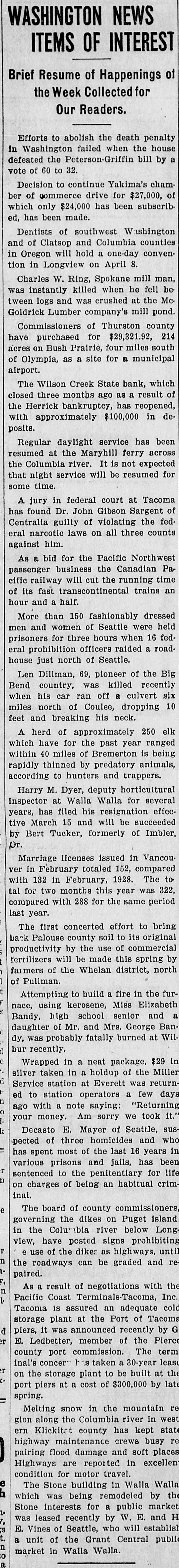 WASHINGTON NEWS ITEMS OF INTEREST Brief Resume of Happenings of the Week Collected for Our Readers. Efforts to abolish the death penalty in Washington failed when the house defeated the Peterson-Griffin bill by a vote of 60 to 32. Decision to continue Yakima's chamber of commerce drive for $27,000, of which only $24,000 has been subscribed, has been made. Dentists of southwest Washington and of Clatsop and Columbia counties in Oregon will hold a one-day convention in Longview on April 8. Charles W. Ring, Spokane mill man, was instantly killed when he fell between logs and was crushed at the McGoldrick Lumber company's mill pond. Commissioners of Thurston county have purchased for $29,321.92, 214 acres on Bush Prairie, four miles south of Olympia, as a site for a municipal airport. The Wilson Creek State bank, which closed three months ago as a result of the Herrick bankruptcy, has reopened, with approximately $100,000 in deposits. Regular daylight service has been resumed at the Maryhill ferry across the Columbia river. It is not expected that night service will be resumed for some time. A jury in federal court at Tacoma has found Dr. John Gibson Sargent of Centralia guilty of violating the federal narcotic laws on all three counts against him. As a bid for the Pacific Northwest passenger business the Canadian Pacific railway will cut the running time of its fast transcontinental trains an hour and a half. More than 150 fashionably dressed men and women of Seattle were held prisoners for three hours when 16 federal prohibition officers raided a roadhouse just north of Seattle. Len Dillman, 69, pioneer of the Big Bend country, was killed recently when his car ran off a culvert six miles north of Coulee, dropping 10 feet and breaking his neck. A herd of approximately 250 elk which have for the past year ranged within 40 miles of Bremerton is being rapidly thinned by predatory animals, according to hunters and trappers. Harry M. Dyer, deputy horticultural inspector at Walla Walla for several years, has filed his resignation effective March 15 and will be succeeded by Bert Tucker, formerly of Imbler, Dr. Marriage licenses issued in Vancouver in February totaled 152, compared with 132 in February, 1928. The to tal for two months this year was 322, compared with 288 for the same period last year. The first concerted effort to bring back Palouse county soil to its original productivity by the use of commercial fertilizers will be made this spring by farmers of the Whelan district, north of Pullman. Attempting to build a fire in the furnace, using kerosene, Miss Elizabeth Bandy, high school senior and a daughter of Mr. and Mrs. George Bandy, was probably fatally burned at Wilbur recently. Wrapped in a neat package, $29 in silver taken in a holdup of the Miller Service station at Everett was returned to station operators a few days ago with a note saying: "Returning your money. Am sorry we took it." Decasto E. Mayer of Seattle, suspected of three homicides and who has spent most of the last 16 years in various prisons and jails, has been sentenced to the penitentiary for life on charges of being an habitual criminal. The board of county commissioners, e governing the dikes on Puget island in the Columbia river below Longview, have posted signs prohibiting