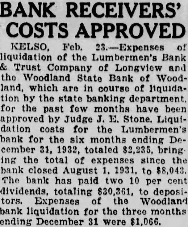 BANK RECEIVERS' COSTS APPROVED KELSO, Feb. 23.-Expenses of liquidation the Bank Trust of Longview and the Woodland State Bank of Woodland, which are in of liquidation by the state banking department for the past few months have been approved by Judge E. Stone. Liquidation costs for the Lumbermen's bank for the six months ending De31, 1932, totaled bring ing the of bank closed August 1931. to $8,043 The bank has paid two 10 per cent dividends, totaling $30,361. to depositors. Expenses the Woodland bank liquidation for the three months ending December 31 were $1,066.