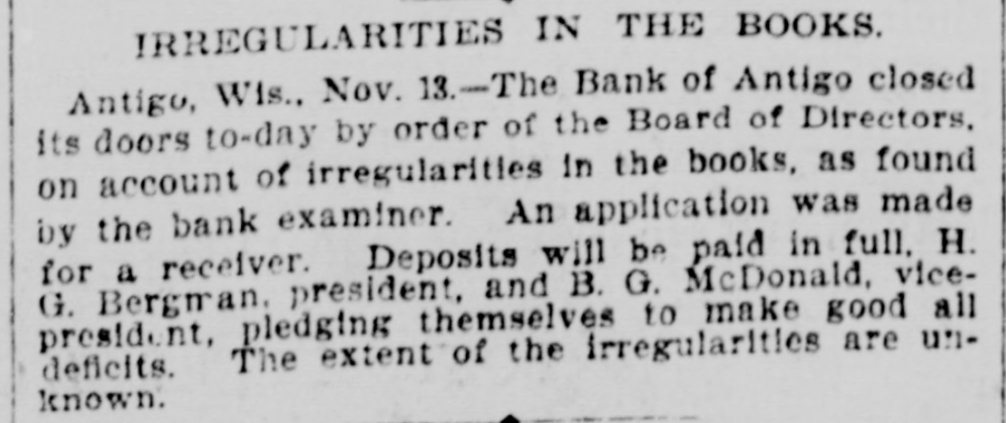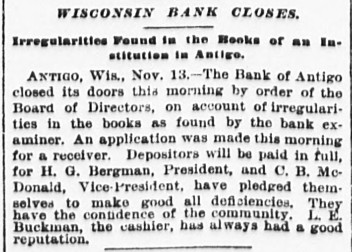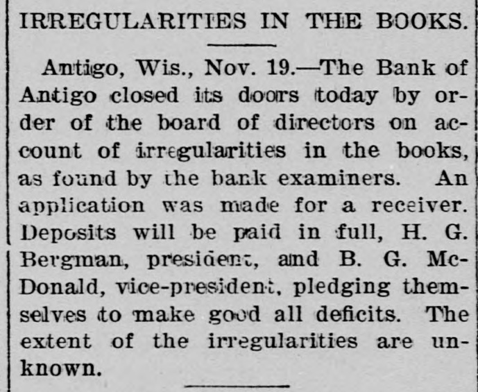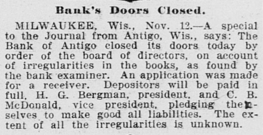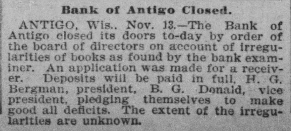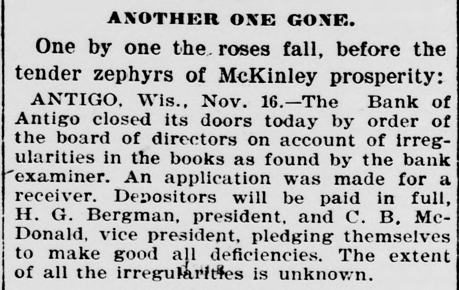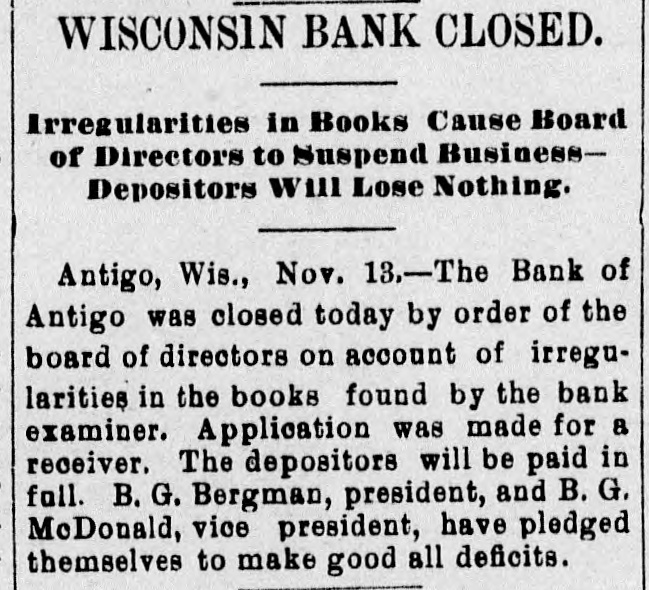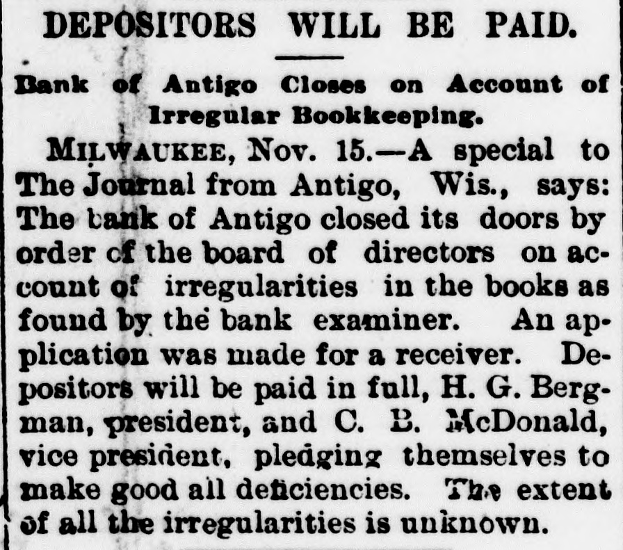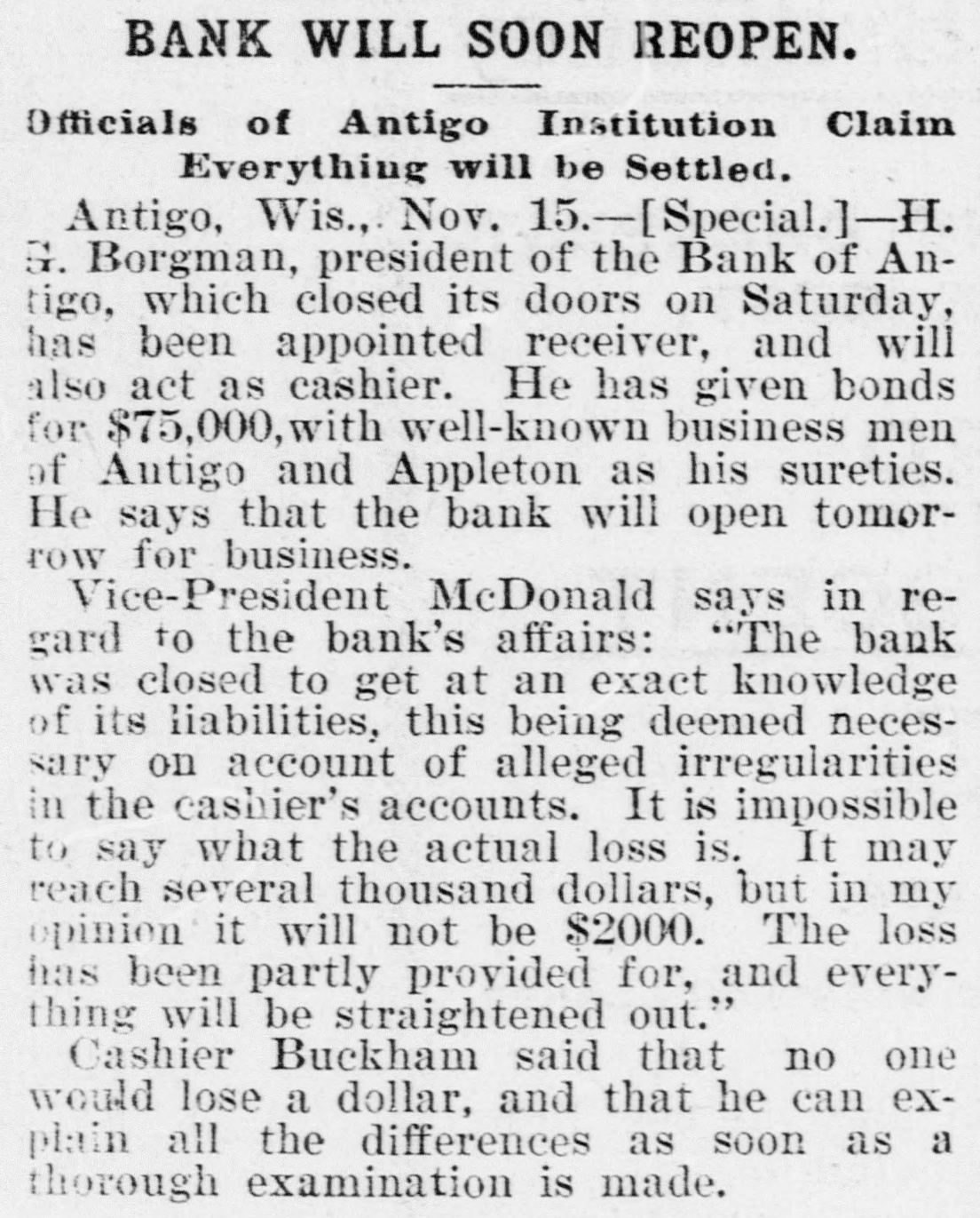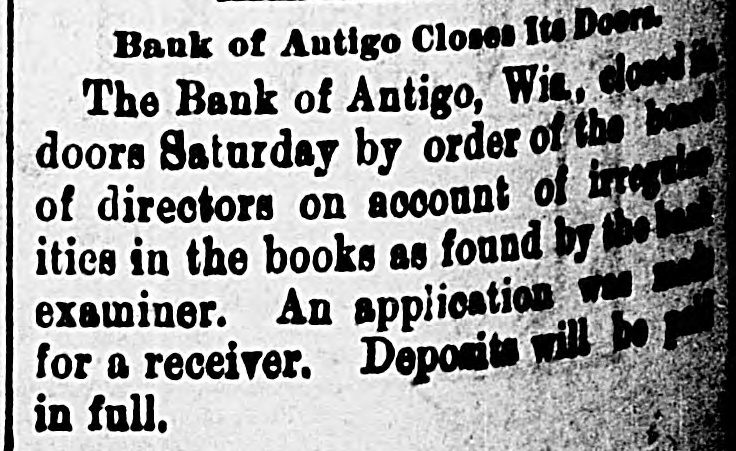 The bank of Antigo, Wis., has been relieved of a receiver by an order from the circuit court. All depositors will be paid in full.