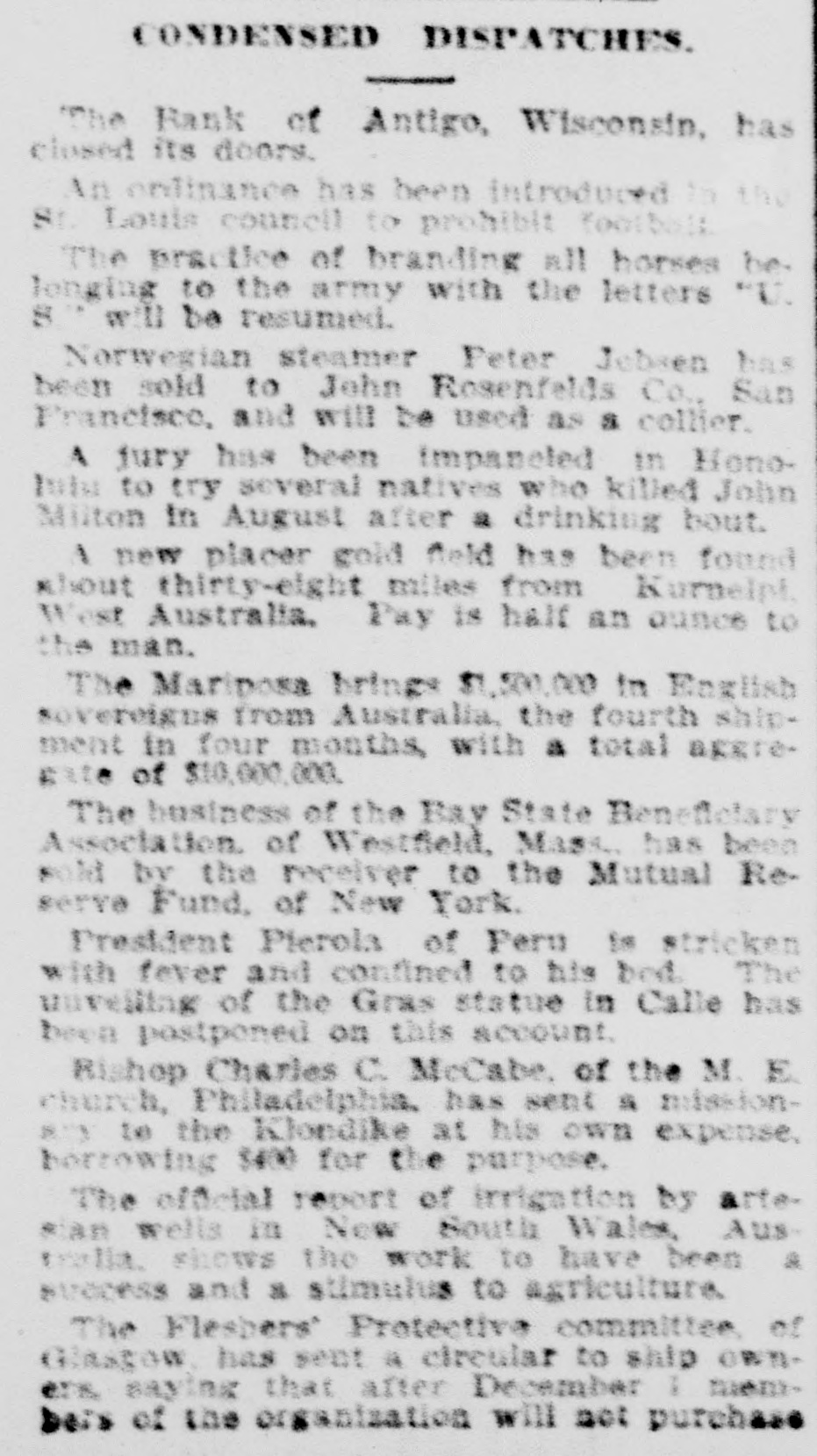 John Sweeney, aged 23 years, was caught in shafting at Dayton, O., and hurled about until both of his legs were torn off below the knee.