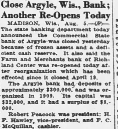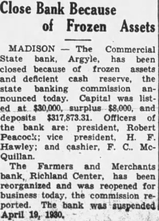 Close Bank Because of Frozen Assets MADISON The Commercial State bank, Argyle, has been closed because of frozen assets and deficient cash reserve, the state banking commission announced today. Capital was listed at $30,000, surplus $8,000, and deposits $317,873.31. Officers of the bank are: president, Robert Peacock; vice president, H. F. Hawley; and cashier, F. C.. McQuillan. The Farmers and Merchants bank, Richland Center, has been reorganized and was reopened for business today, the commission reported. The bank was suspended April 19, 1930.