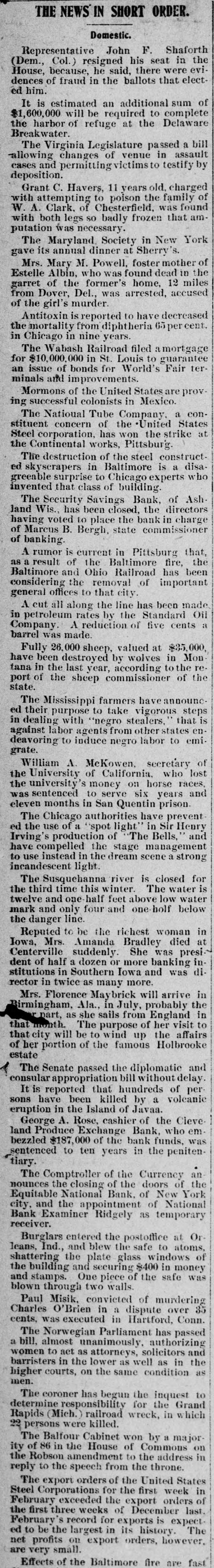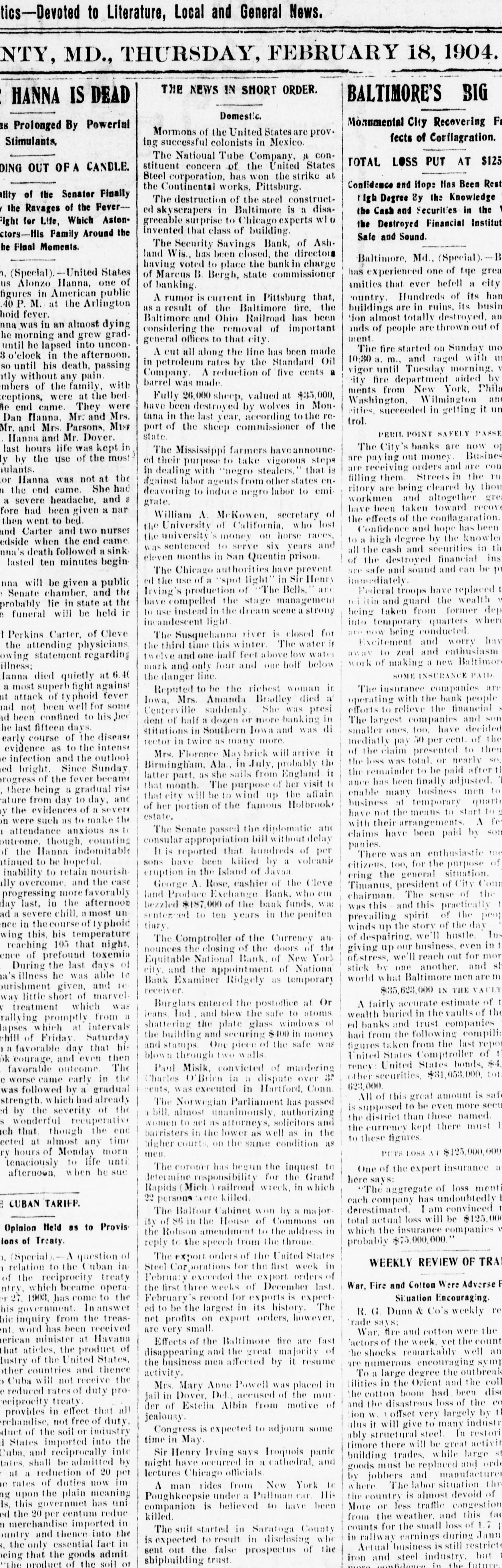 tics-Devoted to Literature, Local and General News. NTY, MD., THURSDAY, FEBRUARY 18, 1904. THE NEWS IN SHORT ORDER. BALTIMORE'S BIG HANNA IS DEAD Domestic. Monumental City Recovering Fr as Prolonged By Powerial Mormons of the United States are prov. fects of Cotifagration. Stimulants, ing successful colonists in Mexico The Natioual Tube Company, a conTOTAL LOSS PUT AT $125 stituent concern of the United States DING OUT OF A CANDLE. Steel corporation, has won the strike at Confidence and Hope Has Been Rest the Continental works, Pittsburg. lity of the Senator Finally ligh Degree By the Knowledge The destruction of the steel construct/ the Ravages of the Feverthe Cash and Securities in the ed skyscrapers in Baltimore is a disagreeable surprise to Chicago experts wlo Fight for Life, Which Astonthe Destroyed Financial Institut invented that class of building. ctors-His Family Around the Safe and Sound. The Security Savings Bank, of Ash. the Final Moments. land Wis., has been closed, the directors Baltimore, Md., (Special). having voted to place the bank in charge has experienced one of tye grea h, (Special).- States of Marcus B. Bergh, state commissioner us Alonzo Hanna, one of amities that ever befell a city of banking figures in American public country. Hundreds of its han A rumor is current in Pittsburg that, 40 P. M. at the Arlington as a result of the Baltimore fire, the buildings are in ruins, its busin hoid fever. Baltimore and Ohio Railroad has been tion almost totally destroyed. an nna was in an almost dying ands of people are thrown out of considering the removal of important he morning and grew gradment general offices to that city. until he lapsed into unconThe fire started on Sunday me A cut all along the line has been made 3 'clock in the afternoon. 10:30 a. m., and raged with 11 in petroleum rates by the Standard Oil so until his death, passing vigor until Tuesday morning, a Company. A reduction of five cents ntly without any pain ity fire department aided by barrel was made mbers of the family, with ments from New York. Phila Fully 26,000 sheep. valued at $35,000, ceptions, were at the bed Washington, Wilmington an have been destroyed by wolves in Monie end came. They were cities, succeeded in getting it un Dan Hanna, Mr. and Mrs. tana in the last year, according to the retrol. Mr. and Mrs. Parsons, Miss port of the sheep commissioner of the PERIL POINT SAFELY PASSE state. Hanna and Mr. Dover. The City's banks are now o last hours life was kept in The Mississippi farmers haveannoune are paying out money Busines y by the use of the most ed their purpose to take vigorous steps are receiving orders and are con guiants. in dealing with "negro stealers. that is filling them Streets in the 111 or Hanna was not at the against labor agents states en. ritory are being cleared by thou n the end came. She had deavoring to induce negro labor to emiworkmen and altogether grea a severe headache, and a grate. have been taken toward recove fore had been given a nar William A. McKowen, secretary of the effects of the conflagaration. then went to bed. the University of California. who lost Confidence and hope has been and Carter and two nurses the university's money on horse races, to a high degree by the knowled edside when the end came was sentenced to serve six years and all the cash and securities in th nna's death followed a sink eleven months in San Quentin prison. of the destroyed financial ins lasted ten minutes begin are safe and sound and can be I'll The Chicago authorities have prevent immediately. ed the use of a spot light in Sir Henry nna will be given a public 1 Federal troops have replaced Irving's production of The Bells, an : Senate chamber, and the itin and guard the wealth have compelled the stage management probably lie in state at the to use instead in the dream scene a strong being taken from former den e funeral will be held ir incandescent light into temporary quarters where now being conducted 1 Perkins Carter, of Cleve The Susquehanna river is closed for Excitement and worry has the third time this winter The water is the attending physicians away to zeal and enthusiasm twelve and one half feet above low water owing statement regarding work of making a new Baltimor illness: mark and only four and one holf below SOME INSURANCE PAID Hanna died quietly at 40 the danger line a most superb fight against The insurance companies are Reputed to be the richest woman in nt attack of typhoid fever operating with the bank people Iowa, Mrs. Amanda Bradley died a had not been well for some efforts to relieve the financial Centerville suddenly She was presi d been confined to his bed dent of half a dozen or more banking in The largest companies and son the last fifteen days. smaller ones, 100 have decided stitutions in Southern low: and was di early course of the disease mediatly pay 50 per cent. of the rector in twice as many more evidence as to the intense of the claim presented to then Mrs. Florence May brick will arrive it le infection and the outlook the loss was total. or nearly so Birmingham, Ala. in July, probably the ed bright. Since Sunday the remainder to be paid after 11 latter part. as she sails from England it progress of the fever became ance has been finally adjusted. that month. The purpose of her visit to . there being 21 gradual rise enable many business men to that city will be to wind up the affair fature from day to day, and business at temporary quarte of her portion of the famous Holbrook y the evidences of a severe have not the means to start 10 g estate. n were such as to make the with their arrangements A fes The Senate passed the diplomatic and I attendance anxious claims have been paid by son consular appropriation bill without delay outcome, though, counting panies. of the Hanna indomitable It is reported that hundreds of per There was an enthusiastic sons have been killed by a volcanio atinued to be hopeful. citizeus, too, for the purpose of cruption 
