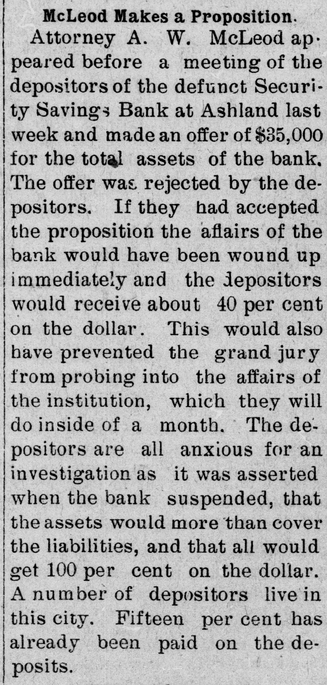 Another dividend has been declared by the receivers of the defunct Security Savings Bank at Ashland. Those who live in this city, who had deposits in the bank can get their dividends by writing J. A. Paulson and Dr. Schlect, receivers, Ashland, Wis.