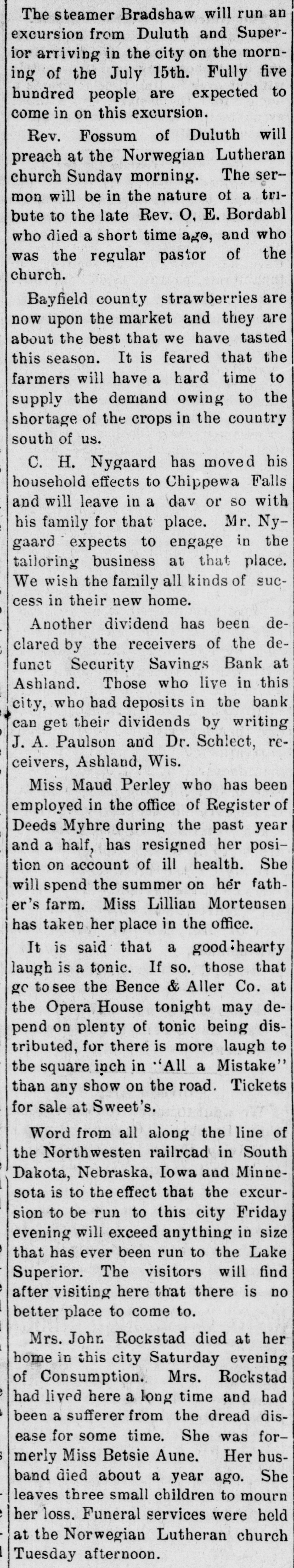 Mrs. John Rockstad died at her home in this city Saturday evening of Consumption. Mrs. Rockstad had lived here a long time and had been a sufferer from the dread disease for some time. She was formerly Miss Betsie Aune. Her husband died about a year ago. She leaves three small children to mourn her loss. Funeral services were held at the Norwegian Lutheran church Tuesday afternoon.