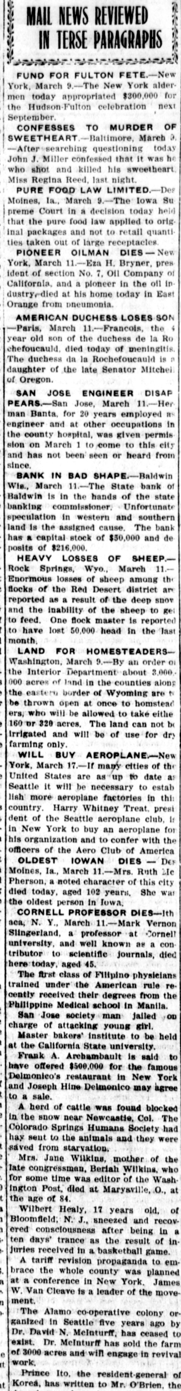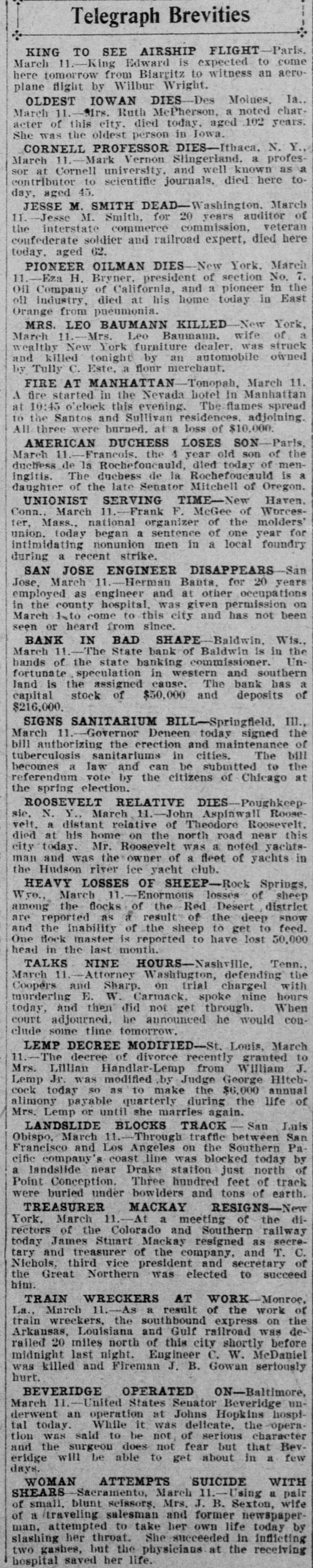 Telegraph Brevities KING TO SEE AIRSHIP FLIGHT-Paris March 11. King Edward is expected to come here tomorrow from Biarritz to witness an aeroplane flight by Wilbur Wright. OLDEST IOWAN DIES Des Moines, la. 11. Airs. Ruth McPherson, a noted char March acter of this city, died today. aged 102 years. She was the oldest person in Iowa. CORNELL PROFESSOR DIES-Ithaca, N. Y. 11. Mark Vernon Slingerland. a profesMarch at Cornell university, and well known as a contributor sor to scientific journals, died here today, aged 45. JESSE M. SMITH DEAD-Washington, March of Jesse M. Smith. for 20 years auditor 11. interstate commerce commission, veteran confederate the soldier and railroad expert, died here today. aged 62. PIONEER OILMAN DIES New York. March 7. Eza H. Bryner. president of section No. 11 of California, and a pioneer in the oil industry. Oil Company died at his home today in East Orange from pneumonia. MRS. LEO BAUMANN KILLED New York, March 11. Mrs. Leo Baumann. wife of a wealthy New York furniture dealer, was owned struck and killed tonight by an automobile by Tully C. Este, a flour merchant. FIRE AT MANHATTANTonopah, March 11. A fire started in the Nevada hotel in Manhattan at 10:45 o'clock this evening. The flames spread to the Santos and Sullivan residences. adjoining All three were burned. at a loss of $10,000. AMERICAN DUCHESS LOSES SON Paris, 11 Francois. the 4 year old son of the duclfess March de la Rochefoncauld, died today of meningitis. The duebess de la Rochefoucauld is a daughter of the late Senator Mitchell of Oregon. UNIONIST SERVING TIME-New Haven. Conn., March 11. Frank F. McGee of Worcester, Mass.. national organizer of the molders' union. today began a sentence of one year for intimidating nonunion men in a local foundry during a recent strike. SAN JOSE ENGINEER DISAPPEARS San Jose, March 11 Herman Banta, for 20 years employed as engineer and at other occupations in the county hospital, was given permission on March 1 to come to this city and has not been seen or heard from since. BANK IN BAD SHAPE Baldwin, Wis. March 11 The State bank of Baldwin is in the Unhands of the state banking commissioner. fortunate speculation in western and southern land is the assigned cause. The bank has a capital stock of $50,000 and deposits of $216,000. SIGNS SANITARIUM BILL-Springfield, III. March 11 Governor Deneen today signed the bill authorizing the erection and maintenance of bill tuberculosis sanitariums in cities. The becomes a law and can be submtted to the referendum vote by the citizens of Chicago at the spring election. ROOSEVELT RELATIVE DIES Poughkeep sie, N. Y., March 11. -John Aspinwall Roose velt. a distant relative of Theodore Roosevelt. died at his home on the north road near this city today. Mr. Roosevelt was a noted yachtsman and was the owner of a fleet of yachts in the Hudson river ice yacht club. HEAVY LOSSES OF SHEEP-Ro Springs, Wro., March 11. Enormons lossés of sheep among the flocks of the Red Desert district are reported as a result of the deep snow and the inability of the sheep to get to feed. One Hock master is reported to have lost 50,000 head in the last month. TALKS NINE HOURS-Nashville Tenn., March 11. Attorney Washfugton, defending the Coopers and Sharp. on trial charged with murdering E. W. Carmack. spoke nine hours today, and then did not get through. When court adjourned. he announced he would conclude some time tomorrow LEMP DECREE MODIFIED-St. Louis, March 11.-The decree of divorce recently granted to Mrs. Lillian Handlar-Lemp from William J. Lemp Jr. was modified .by Judge George Hitchcock today so as to make the $6,000 annual of alimony payable quarterly during the life Mrs. Lemp or until she marries again. LANDSLIDE BLOCKS TRACK San Luis Obispo, March 11. Through traffle between San Francisco and Los Angeles on the Southern Pacific company's coast line was blocked today by a landslide near Drake station just north of Point Conception. Three hundred feet of track were buried under bowlders and tons of earth. TREASURER MACKAY RESIGNS-New York. March 11 At a meeting of the directors of the Colorado and Southern railway today James Stuart Mackay resigned as secreand treasurer of the company. and T. C. tary Nichols, third vice president and secretary of the Great Northern was elected to succeed him. TRAIN WRECKERS AT WORK-Monroe March 11. As a result of the work of train La., wreckers, the southbound express on the Arkansas, Louisiana and Gulf railroad was derailed 20 miles north of this city shortly before midnight last night. Engineer c. W. McDaniel was killed and Fireman J. B. Gowan seriously hurt. BEVERIDGE OPERATED ON-Baltimore, 11 United States Senator Beveridge unMarch derwent an operation at Johns Hopkins hospitoday. While it was delicate. the operatal said to be not of serious character tion and the was surgeon does not fear but that Beveridge will be able to get about in a few days. WOMAN ATTEMPTS SUICIDE WITH SHEARS Sacramento, March 11. Using a pair of small. blunt seissors, Mrs. J. B. Sexton, wife of a traveling salesman and former newspaperattempted to take her own life today by slashing man. her throat. She succeeded in inflicting two gashes, but the physicians at the receiving hospital saved her life.