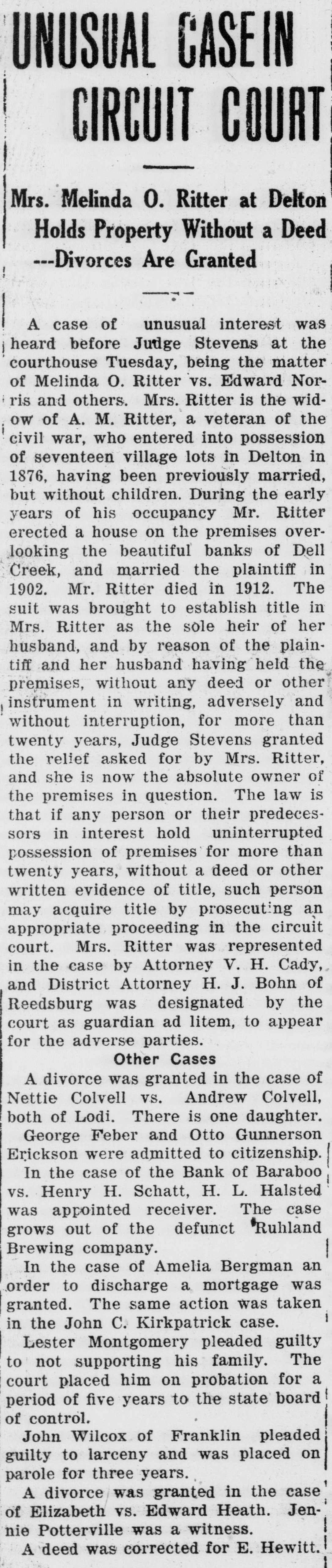 UNUSUAL CASE IN CIRCUIT COURT Mrs. Melinda 0. Ritter at Delton Holds Property Without a Deed ---Divorces Are Granted A case of unusual interest was heard before Judge Stevens at the courthouse Tuesday, being the matter of Melinda O. Ritter vs. Edward Norris and others. Mrs. Ritter is the widow of A. M. Ritter, a veteran of the civil war, who entered into possession of seventeen village lots in Delton in 1876, having been previously married, but without children. During the early years of his occupancy Mr. Ritter erected a house on the premises overlooking the beautiful banks of Dell Creek, and married the plaintiff in 1902. Mr. Ritter died in 1912. The suit was brought to establish title in Mrs. Ritter as the sole heir of her husband, and by reason of the plaintiff and her husband having held the premises, without any deed or other instrument in writing, adversely and without interruption, for more than twenty years, Judge Stevens granted the relief asked for by Mrs. Ritter, and she is now the absolute owner of the premises in question. The law is that if any person or their predecessors in interest hold uninterrupted possession of premises for more than twenty years, without a deed or other written evidence of title, such person may acquire title by prosecuting an appropriate proceeding in the circuit court. Mrs. Ritter was represented in the case by Attorney V. H. Cady, and District Attorney H. J. Bohn of Reedsburg was designated by the court as guardian ad litem, to appear for the adverse parties. Other Cases A divorce was granted in the case of Nettie Colvell VS. Andrew Colvell, both of Lodi. There is one daughter. George Feber and Otto Gunnerson Erickson were admitted to citizenship. In the case of the Bank of Baraboo VS. Henry H. Schatt, H. L. Halsted was appointed receiver. The case grows out of the defunct Ruhland Brewing company. In the case of Amelia Bergman an order to discharge a mortgage was granted. The same action was taken in the John C. Kirkpatrick case. Lester Montgomery pleaded guilty to not supporting his family. The court placed him on probation for a period of five years to the state board of control. John Wilcox of Franklin pleaded guilty to larceny and was placed on parole for three years. A divorce was granted in the case of Elizabeth vs. Edward Heath. Jennie Potterville was a witness. A deed was corrected for E. Hewitt.