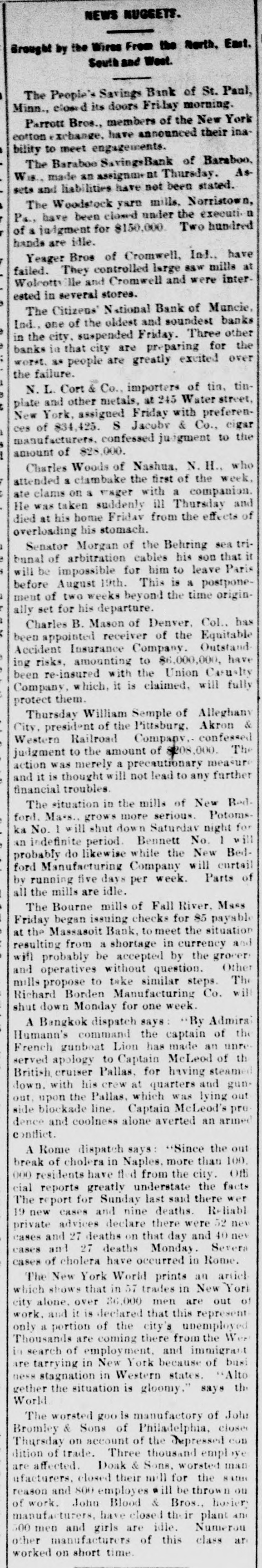 NEWS NUGGETS. Brought by the Wires From the North, East. South and West. The People's Savings Bank of St. Paul, Minn., closed its doors Friday morning. Parrott Bros., members of the New York cotton xchange, have announced their insbility to meet engagements. The Baraboo SavingsBank of Baraboo, Wis., made an assignme nt Thursday. Assets and liabilities have not been stated. The Woodstock yarn mills, Norristown, Pa., have been closed under the executi- a of a judgment for $150,000. Two hundred hands are idle. Yeager Bros of Cromwell, Ind., have failed. They controlled large saw mills at Wolcotty Ille and Cromwell and were interested in several stores. The Citizens' National Bank of Muncie, Ind., one of the oldest and soundest banks in the city, suspended Friday. Three other banks in that city are preparing for the worst. as people are greatly excited over the failure. N. L. Cort & Co., importers of tin, tinplate and other metals, at 245 Water street, New York, assigned Friday with preferences of $34,425. S Jacoby & Co., cigar manufacturers. confessed judgment to the amount of $28,000. Charles Woods of Nashua, N. H., who attended a clambake the first of the week, ate clams on a wager with a companion. He was taken suddenly ill Thursday and died at his home Fridav from the effects of overloading his stomach. Senator Morgan of the Behring sea tribunal of arbitration cables his son that it will be impossible for him to leave Paris before August 19th. This is a postponement of two weeks beyond the time originally set for his departure. Charles B. Mason of Denver. Col., has been appointed receiver of the Equitable Accident Insurance Company. Outstand ing risks, amounting to $6,000,000, have been re-insured with the Union Casualty Company, which, it is claimed, will fully protect them. Thursday William Semple of Alleghany City, president of the Pittsburg, Akron & Western Railroad Company.. confessed judgment to the amount of $208,000. The action was merely a precautionary measure and it is thought will not lead to any further financial troubles. The situation in the mills of New Red. ford. Mas.. grows more serious. Potomska No. 1 ill shut down Saturday night for an indefinite period. Bennett No. 1 will probably do likewise while the New Bedford Manufacturing Company will curtail by running five days per week. Parts of all the mills are idle. The Bourne mills of Fall River. Mass Friday began issuing checks for 85 payable at the Massasoit Bank, to meet the situation resulting from a shortage in currency and will probably be accepted by the grocers and operatives without question. Other mills propose to take similar steps. The Richard Borden Manufacturing Co. will shut down Monday for one week. A Bangkok dispatch says: "By Admiral Humann's command the captain of the French gunboat Lion has made an unreserved apology to Captain McLeod of th British cruiser Pallas, for having steamed down. with his crew at quarters and gunout, upon the Pallas, which was lying out side blockade line. Captain McLeod's pro dence and coolness alone averted an armed conflict. A Rome dispatch says: "Since the out break of cholera in Naples, more than 100. 000 residents have flud from the city. Offi cial reports greatly understate the facts The report for Sunday last said there wer 19 new cases and nine deaths. Reliabl private advices declare there were 52 new cases and 27 deaths on that day and 40 nev cases and 27 deaths Monday. Severa cases of cholera have occurred in Rome. The New York World prints an articl