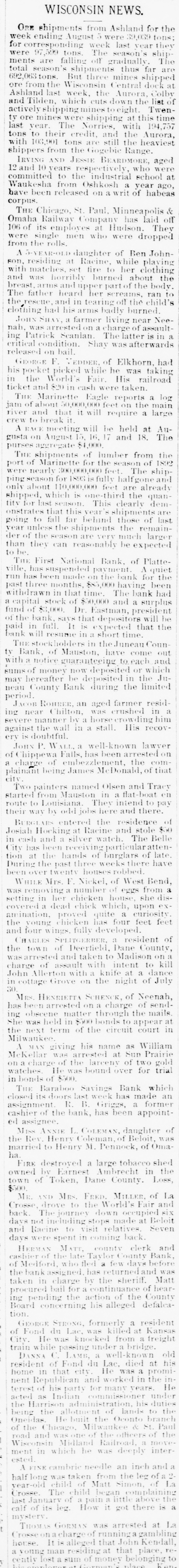 # WISCONSIN NEWS. YEAR-OLD daughter of Ben Johnson siding at Racine, while playing matches, set fire to her clothing as horribly burned about the arms and upper part of the body. Her father heard her screams, ran to the rescue, and in tearing off the child's clothing had his arms badly burned. SHAY, a farmer living near Neenah, was arrested on a charge of assault-ing Patrick Scanlan. The latter is in a critical condition. Shay was afterwards released on bail. GEORGE F. VEDDER, of Elkhorn, had his pocket picked while he was taking in the World's Fair. His railroad ticket and $20 in cash were taken. Marinette Eagle reports a log jam of about 50,000,000 feet on the main river and that it will require a large force to break it. A NICE meeting will be held at Aurora on August 15, 16, 17 and 18. The prizes aggregate $4,000. The shipments of lumber from the city of Marinette for the season of 1892 were nearly 300,000,000 feet. The shipping season for 1893 is fully half gone and about 110,000,000 feet are already shipped, which is one-third the quantity for last season. This clearly demonstrates that this year's shipments are going to fall far behind those of last season unless the shipments the remainder of the season are very much larger than they can reasonably be expected. First National Bank, of Platteville, has suspended payment. A quiet assessment has been made on the bank for the past three months, $85,000 having been withdrawn in that time. The bank had a capital stock of $50,000 and a surplus of $3,000. Dr. Eastman, president of the bank, says that depositors will be paid in full. It is expected that the bank will resume in a short time. The stockholders in the Juneau County Bank, of Mauston, have come out with a notice guaranteeing to each and every depositor of their bank for the period of one year the payment of all sums of money now deposited or which may hereafter be deposited in the Juneau County Bank during the limited period. JACOB ROHRER, an aged farmer residing near Chilton, was crushed in a terrible manner by a horse crowding him against the wall in a stall. His recovery is doubtful. JOHN P. WALL, a well-known lawyer of Chippewa Falls, has been arrested on a charge of embezzlement, the complainant being James McDonald, of that city. Two painters named Olsen and Tracy departed from Mauston in a flat-boat en route to Louisiana. They intend to pay their way by odd jobs here and there. BURGLARS entered the residence of Josiah Hocking at Racine and stole $50 in cash and a silver watch. The Belle City has been receiving particular attention at the hands of burglars of late. During the past three weeks there have been over twenty houses robbed. WHILE Mrs. F. Nickel, of West Bend, was removing a number of eggs from a setting in her chicken house, she discovered a dead chick which, upon examination, proved quite a curiosity. The young chicken has four feet feet and four wings, fully developed. CHARLES SPLITGERBER, a resident of the town of Deerfield, Dane County, was arrested and taken to Madison on a charge of assault with intent to kill one Allerton with a knife at a dance at Cottage Grove on the night of July 4. MRS. HENRIETTA SCHENCK, of Neenah, has been arrested on a charge of sending obscene matter through the mails. She was held in $500 bonds to appear at the next term of the circuit court in Winnebago county. A MAN giving his name as William Kellar was arrested at Sun Prairie on a charge of the larceny of two gold watches. He was bound over for trial under bonds of $500. THE Baraboo Savings Bank which closed its doors last week has made an assignment. R. B. Griggs, a former cashier of the bank, has been appointed as assignee. MISS ANNIE L. COLEMAN, daughter of Rev. Henry Coleman, of Beloit, was married to Henry M. Pennock, of Omaha. FIRE destroyed a large tobacco shed owned by Earnest Ambrecht in the town of Token, Dane County. Loss, $1,000. MR. AND MRS. FRED. MILLER, of La Crosse, drove to the World's Fair and back. The journey down occupied six days not including stops made at Beloit and Racine to visit relatives. Seven days were spent in coming back. HERMAN MATT, county clerk and cashier of the late Taylor County Bank, of Medford, who fled a few days before the bank assigned, has returned and was taken in charge by the sheriff. Matt secured bail for a continuance of hearing pending the action of the County Board concerning his alleged defalcation. GEORGE STRONG, formerly a resident of Fond du Lac, was killed at Kansas City. He was knocked from a freight train while passing under a bridge. DANNA C. LAMB, a well-known old resident of Fond du Lac, died at his home in that city. He was a prominent Republican and worked in the interest of his party for many years. He served as Indian commissioner under the Harrison administration, his duties being the allotment of lands to the Oneidas. He built the Oconto branch of the Chicago, Milwaukee & St. Paul railroad and was one of the officers of the Wisconsin Midland Railroad, a movement in which he was deeply interested. A FINE cambric needle an inch and a half long was taken from the leg of a 2-year-old child of Matt Simon, of La Crosse. The child began complaining last January of a pain a little above the knee.