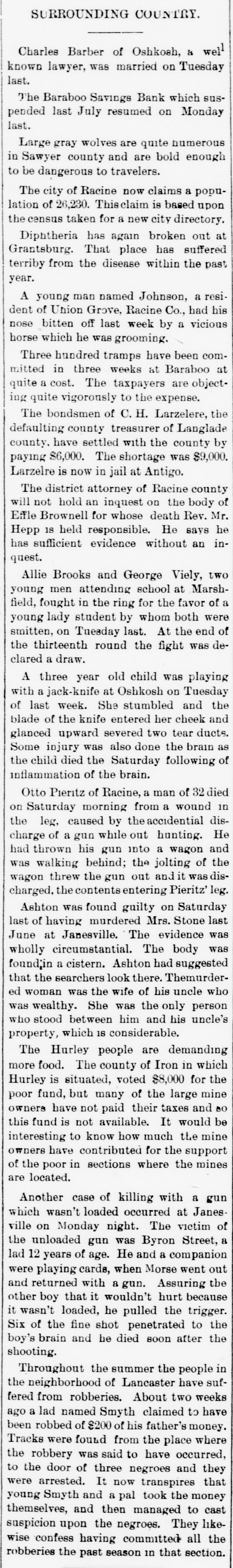 SURROUNDING COUNTRY. Charles Barber of Oshkosh, is well known lawyer, was married on Tuesday last. The Baraboo Savings Bank which suspended last July resumed on Monday last. Large gray wolves are quite humerous in Sawyer county and are bold enough to be dangerous to travelers. The city of Racine now claims a population of 26,230. Thisclaim is based upon the census taken for a new city directory. Diphtheria has again broken out at Grantsburg. That place has suffered terriby from the disease within the past year. A young man named Johnson, a resident of Union Grove, Racine Co., had his nose bitten off last week by a vicious horse which he was grooming. Three hundred tramps have been committed in three weeks at Baraboo at quite a cost. The taxpayers are objecting quite vigorously to the expense. The bondsmen of C. H. Larzelere, the defaulting county treasurer of Langlade county. have settled with the county by paying $6,000. The shortage was $9,000. Larzelre is now in jail at Antigo. The district attorney of Racine county will not hold an inquest on the body of Effle Brownell for whose death Rev. Mr. Hepp IS held responsible. He says he has sufficient evidence without an inquest. Allie Brooks and George Viely, two young men attending school at Marshfield, fought in the ring for the favor of a young lady student by whom both were smitten, on Tuesday last. At the end of the thirteenth round the fight was declared a draw. A three year old child was playing with a jack-knife at Oshkosh on Tuesday of last week. She stumbled and the blade of the knife entered her cheek and glanced upward severed two tear ducts. Some injury was also done the brain as the child died the Saturday following of inflammation of the brain. Otto Pieritz of Racine, a man of 32 died on Saturday morning from a wound in the leg, caused by the accidential discharge of a gun while out hunting. He had thrown his gun into a wagon and was walking behind; the jolting of the wagon threw the gun out and it was discharged, the contents entering Pieritz' leg. Ashton was found guilty on Saturday last of having murdered Mrs. Stone last June at Janesville. The evidence was wholly circumstantial. The body was foundin a cistern. Ashton had suggested that the searchers look there. Themurdered woman was the wife of his uncle who was wealthy. She was the only person who stood between him and his uncle's property, which 18 considerable. The Hurley people are demanding more food. The county of Iron in which Hurley is situated, voted $8,000 for the poor fund, but many of the large mine owners have not paid their taxes and 80 this fund is not available. It would be interesting to know how much the mine owners have contributed for the support of the poor in sections where the mines are located. Another case of killing with a gun which wasn't loaded occurred at Janesville on Monday night. The victim of the unloaded gun was Byron Street, a lad 12 years of age. He and a companion were playing cards, when Morse went out and returned with a gun. Assuring the other boy that it wouldn't hurt because it wasn't loaded, he pulled the trigger. Six of the fine shot penetrated to the boy's brain and he died soon after the shooting. Throughout the summer the people in the neighborhood of Lancaster have suffered from robberies. About two weeks ago a lad named Smyth claimed to have been robbed of $200 of his father's money. Tracks were found from the place where the robbery was said to have occurred, to the door of three negroes and they were arrested. It now transpires that young Smyth and a pal took the money