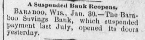 A Suspended Bank Reopens. Barsboo, WIS., Jan. 30.-The Baraboo Savings Bank, which suspended payment last July, opened its doors yesterday.