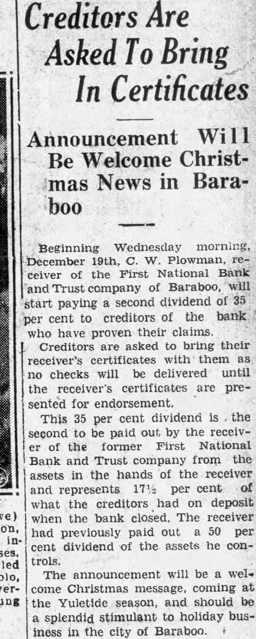 Creditors Bring In Certificates Will Announcement Be Welcome ChristNews in Baraboo Beginning Wednesday morning, December 19th. Plowman, ceiver of the First National Bank of Baraboo, will second dividend of paying creditors of the bank cent who have proven their claims. Creditors asked to bring their receiver's certificates with them no checks will delivered until the receiver's certificates are presented for endorsement. This 35 per cent dividend is the second to be paid out, by the receivof the former First National Bank and Trust company from the assets in the hands of the receiver and represents 17½ per cent of what the creditors had on deposit when the bank closed. The receiver had previously paid out 50 per cent dividend of the assets he controls. The announcement will be welcome Christmas message, coming at Yuletide season, and should be splendid stimulant to holiday business in the city of